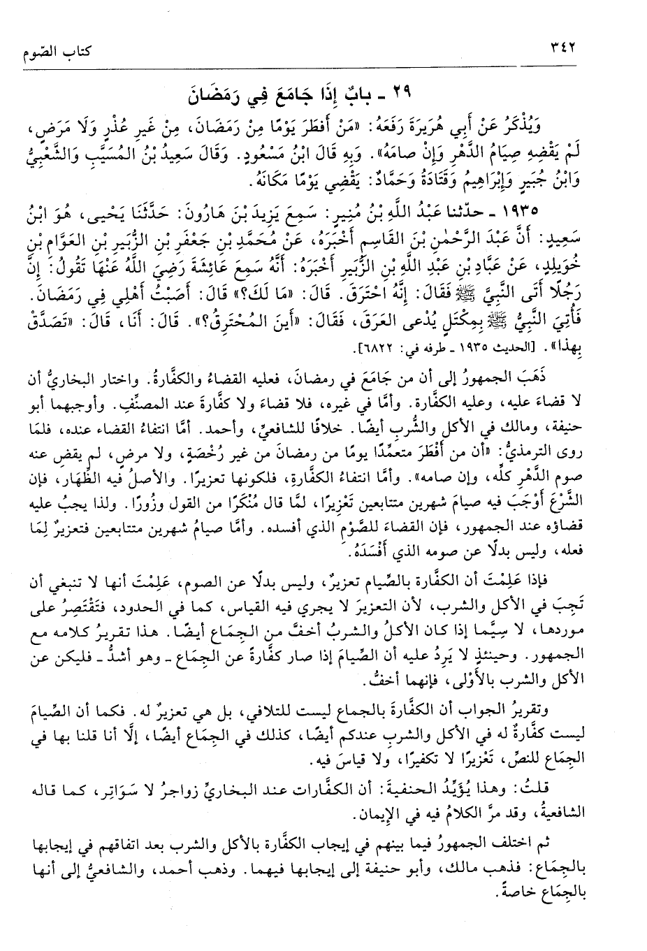 ذَهَبَ الجمهورُ إلى أن من جَامَعَ في رمضانَ، فعليه القضاءُ والكفَّارةُ. واختار البخاريُّ أن لا قضاءَ عليه، وعليه الكفَّارة. وأمَّا في غيره، فلا قضاءَ ولا كفَّارةَ عند المصنِّفِ. وأوجبهما أبو حنيفة، ومالك في الأكل والشُّربِ أيضًا. خلافًا للشافعيِّ، وأحمد. أمَّا انتفاءُ القضاء عنده، فلِمَا روى الترمذيُّ: «أن من أَفْطَرَ متعمِّدًا يومًا من رمضانَ من غير رُخْصَةٍ، ولا مرضٍ، لم يقضِ عنه صوم الدَّهْرِ كلِّه، وإن صامه». وأمَّا انتفاءُ الكفَّارةِ، فلكونها تعزيرًا. والأصلُ فيه الظِّهَار، فإن الشَّرْعَ أَوْجَبَ فيه صيامَ شهرين متتابعين تَعْزِيرًا، لمَّا قال مُنْكَرًا من القول وزُورًا. ولذا يجبُ عليه قضاؤه عند الجمهور، فإن القضاءَ للصَّوْمِ الذي أفسده. وأمَّا صيامُ شهرين متتابعين فتعزيرٌ لِمَا فعله، وليس بدلا عن صومه الذي أَفْسَدَهُ.