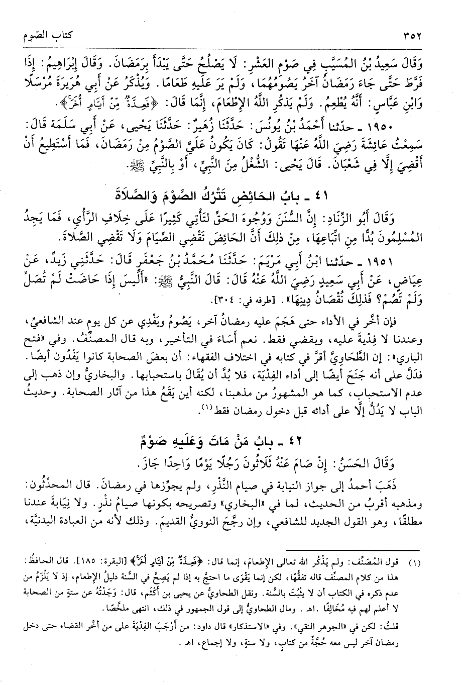 (¬1) قول المُصَنِّف: ولم يَذْكُر الله تعالى الإِطعامَ، إنما قال: {فَعِدَّةٌ مِنْ أَيَّامٍ أُخَرَ} [البقرة: 185]. قال الحافظُ: هذا من كلام المصنِّف قاله تفقُّهًا، لكن إنما يَقْوَى ما احتجَّ به إذا لم يَصِحَّ في السُّنة دليلُ الإِطعام، إذ لا يَلْزَمُ من عدم ذكره في الكتاب أن لا يثْبُتَ بالسُّنة. ونقل الطحاويُّ عن يحيى بن أكْثَم، قال: وَجَدتُهُ عن ستةٍ من الصحابة لا أعلم لهم فيه مُخَالِفًا. اهـ. ومال الطحاويُّ إلى قول الجمهور في ذلك، انتهى ملخَّصًا.