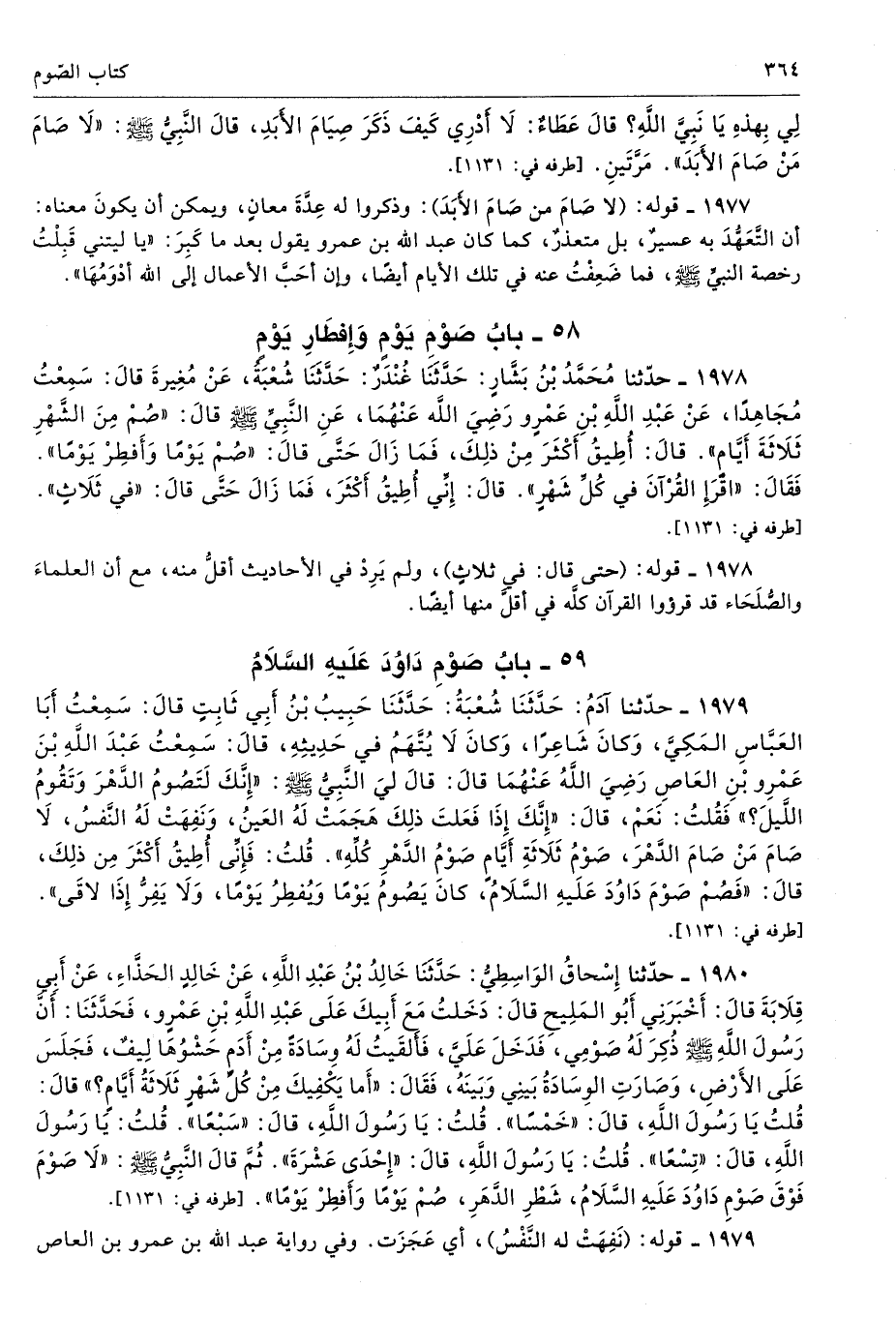 لِى بِهَذِهِ يَا نَبِىَّ اللَّهِ قَالَ عَطَاءٌ لاَ أَدْرِى كَيْفَ ذَكَرَ صِيَامَ الأَبَدِ، قَالَ النَّبِىُّ - صلى الله عليه وسلم - «لاَ صَامَ مَنْ صَامَ الأَبَدَ». مَرَّتَيْنِ. أطرافه 1131، 1152، 1153، 1974، 1975، 1976، 1978، 1979، 1980، 3418، 3419، 3420، 5052، 5053، 5054، 5199، 6134، 6277 تحفة 8635