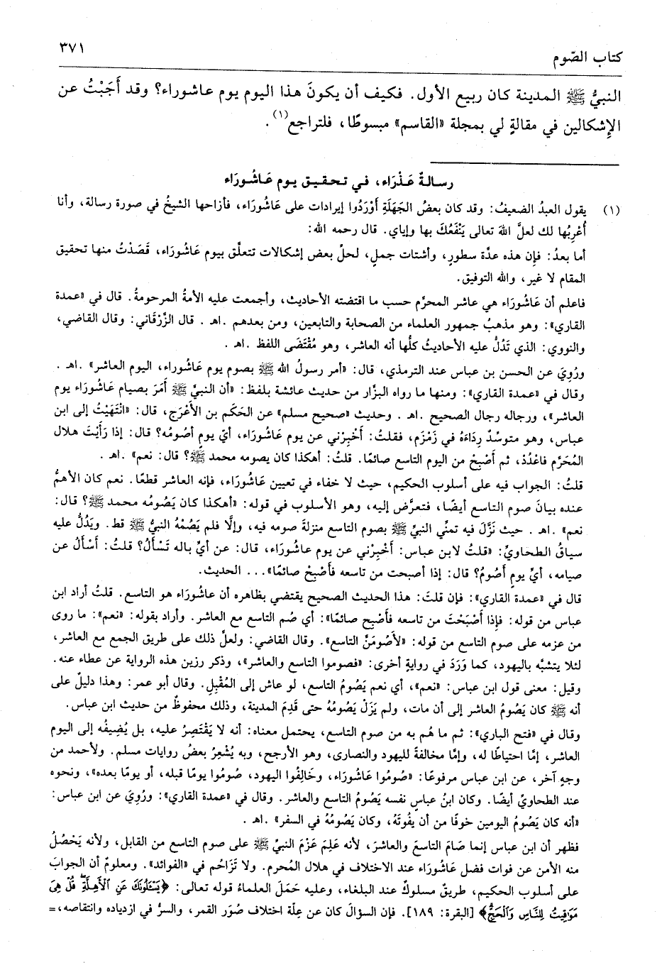 (¬1) يقول العبدُ الضعيفُ: وقد كان بعضُ الجَهَلَةِ أوْرَدُوا إيرادات على عَاشُورَاء، فأزاحها الشيخُ في صورة رسالة، وأنا أُعْرِبُها لك لعلَّ اللهَ تعالى يَنْفَعُكَ بها وإياي. قال رحمه الله: