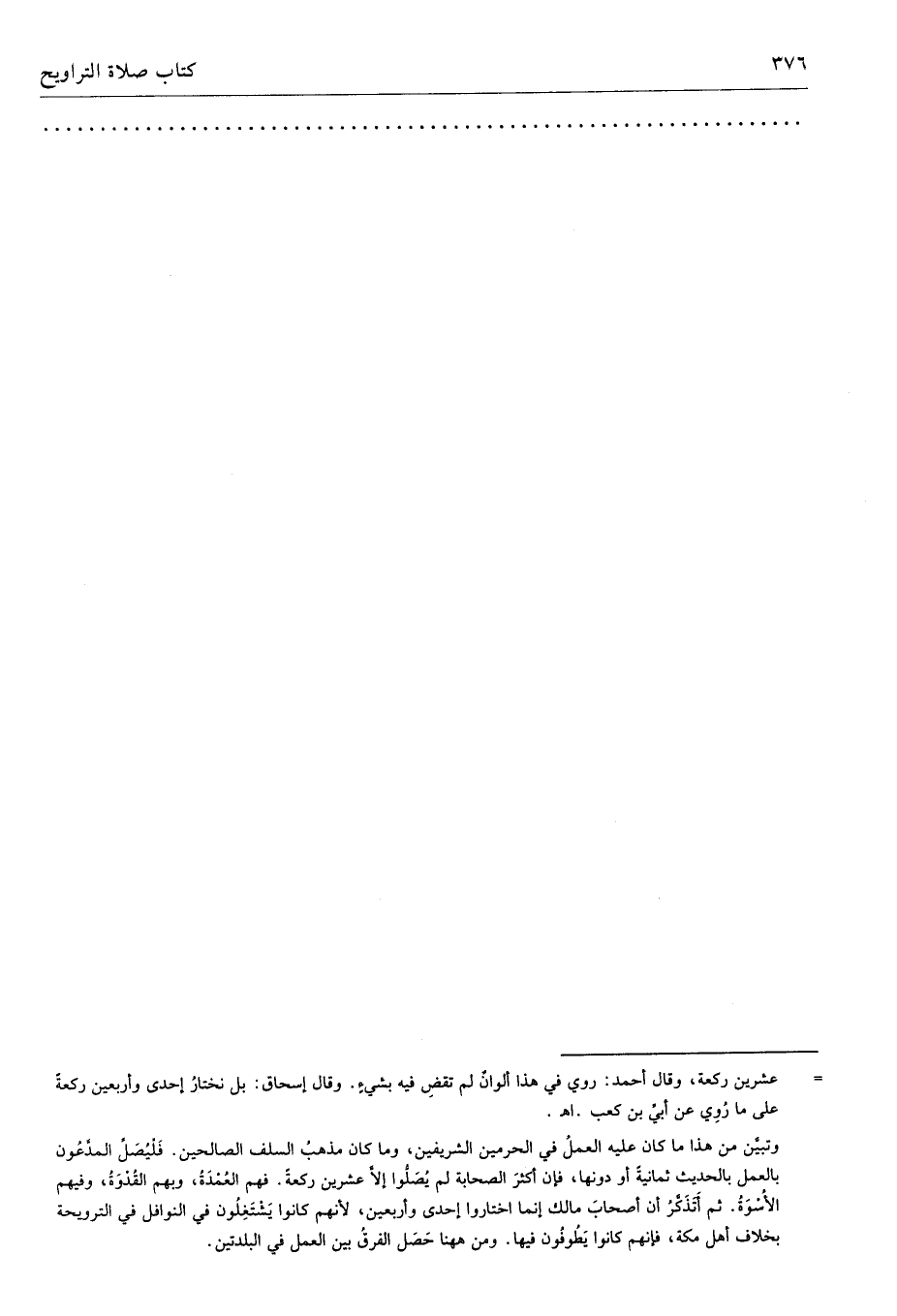 وتبيَّن من هذا ما كان عليه العملُ في الحرمين الشريفين، وما كان مذهبُ السلف الصالحين. فَليُصَل المدَّعُون بالعمل بالحديث ثمانيةً أو دونها، فإن أكثرَ الصحابة لم يُصَلَّوا إلَّا عشرين ركعة. فهم العُمدَةُ، وبهم القُدوَةُ، وفيهم الأُسوَة. ثم أتذَكَّرُ أن أصحابَ مالك إنما اختاروا إحدى وأربعين، لأنهم كانوا يَشتَغِلون في النوافل في الترويحة بخلاف أهل مكة، فإنهم كانوا يَطُوفُون فيها. ومن ههنا حَصَل الفرقُ بين العمل في البلدتين.