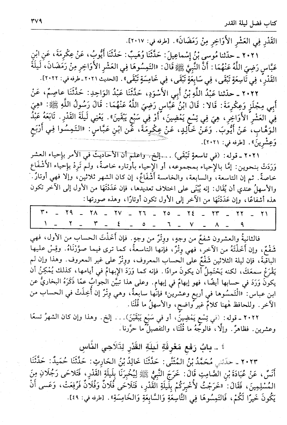فالثانيةُ والعشرون شفعٌ من وجهٍ، ووِتْرٌ من وجهٍ. فإن أَخَذْتَ الحساب من الأول، فهي شَفْعٌ، وإن أَخَذْتَهُ من الآخر، فهي وِتْرٌ، فإنها التاسعةُ، كما ترى فيما صوَّرْنَاهُ. وقِسْ عليها الباقيةَ، فإن ليلة الثلاثين شَفْعٌ على الحساب المعروف، ووِتْرٌ على غير المعروف. وهذا وإن لم يَقْرَعْ سمعَكَ، لكنه يُحْتَمِلُ أن يكونَ مرادًا. فإنه كما وَرَدَ الإِبهامُ في أيامها، كذلك يُمْكِنُ أن يكونَ وَرَدَ في حسابها أيضًا، فهو إبهامٌ في إبهامٍ. وعلى هذا تبيَّن الجوابُ عمّا ذَكَرَهُ البخاريُّ عن ابن عباس: «الْتَمسُوها في أربعٍ وعشرين» فإنها سابعةٌ، وهي وِتْرٌ إن أُخِذَتْ في الحساب من الآخر. وللحافظ ههنا كلامٌ غير واضحٍ، والأسهلُ ما قُلْنَا.