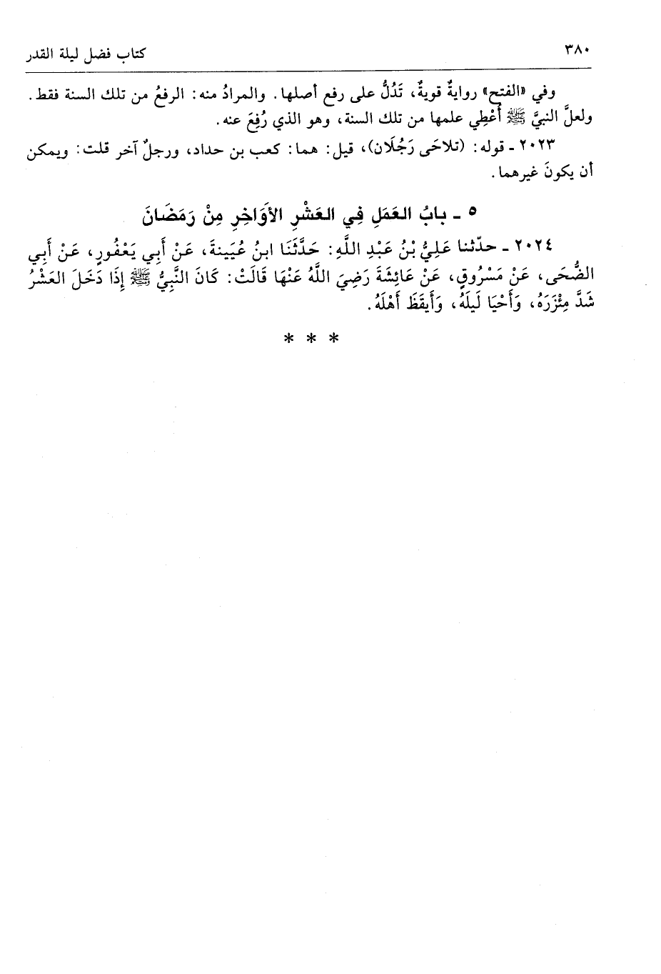 2024 - حَدَّثَنَا عَلِىُّ بْنُ عَبْدِ اللَّهِ حَدَّثَنَا سُفْيَانُ عَنْ أَبِى يَعْفُورٍ عَنْ أَبِى الضُّحَى عَنْ مَسْرُوقٍ عَنْ عَائِشَةَ - رضى الله عنها - قَالَتْ كَانَ النَّبِىُّ - صلى الله عليه وسلم - إِذَا دَخَلَ الْعَشْرُ شَدَّ مِئْزَرَهُ، وَأَحْيَا لَيْلَهُ، وَأَيْقَظَ أَهْلَهُ. تحفة 17637