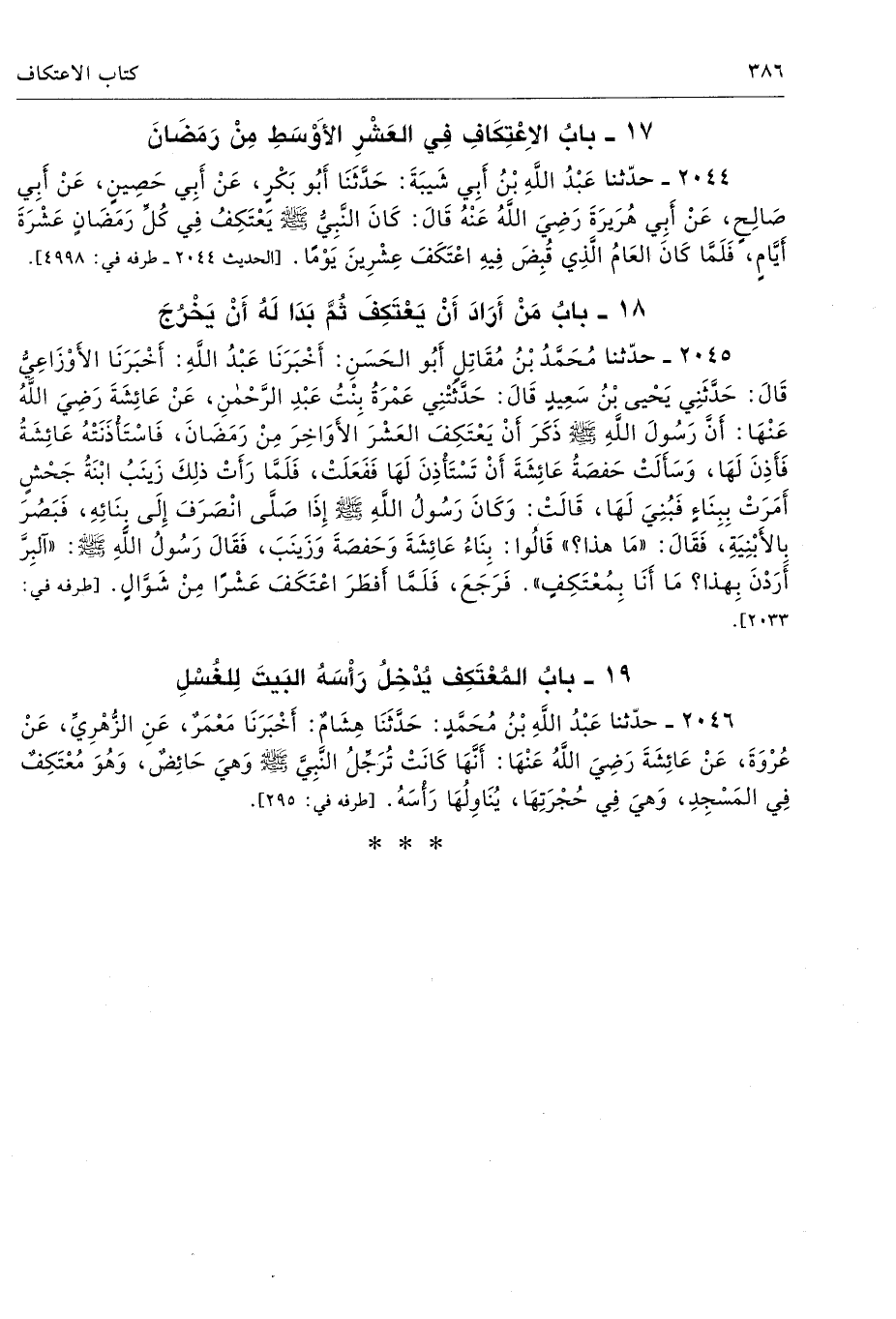 2046 - حَدَّثَنَا عَبْدُ اللَّهِ بْنُ مُحَمَّدٍ حَدَّثَنَا هِشَامٌ أَخْبَرَنَا مَعْمَرٌ عَنِ الزُّهْرِىِّ عَنْ عُرْوَةَ عَنْ عَائِشَةَ - رضى الله عنها - أَنَّهَا كَانَتْ تُرَجِّلُ النَّبِىَّ - صلى الله عليه وسلم - وَهِىَ حَائِضٌ وَهْوَ مُعْتَكِفٌ فِى الْمَسْجِدِ وَهْىَ فِى حُجْرَتِهَا، يُنَاوِلُهَا رَأْسَهُ. أطرافه 295، 296، 301، 2028، 2031، 5925 - تحفة 16641