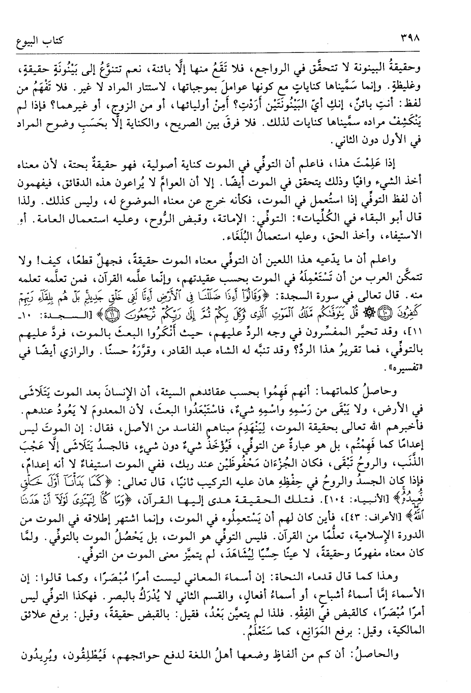 إذا عَلِمْتَ هذا، فاعلم أن التوفِّي في الموت كناية أصولية، فهو حقيقةٌ بجتة، لأن معناه أخذ الشيء وافيًا وذلك يتحقق في الموت أيضًا. إلا أن العوامَّ لا يُراعون هذه الدقائق، فيفهمون أن لفظ التوفِّي إذا استُعمل في الموت، فكأنه خرج عن معناه الموضوع له، وليس كذلك. ولذا قال أبو البقاء في الكُلِّيات»: التوفِّي: الإماتة، وقبض الرُّوح، وعليه استعمال العامة. أو الاستيفاء، وأخذ الحق، وعليه استعمالُ البُلَغَاء.