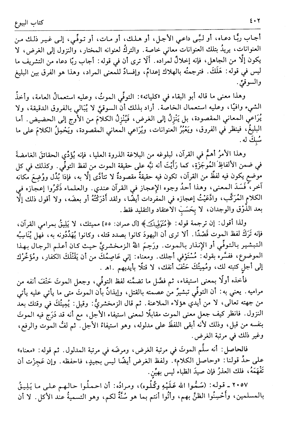 وهذا معنى ما قاله أبو البقاء في «كلياته»: التوفِّي الموتُ، وعليه استعمالُ العامة، وأخذُ الشيء وافيًا، وعليه استعمال الخاصة. أراد بذلك أن السوقيَّ لا يُبَالي بالفروق الدقيقة، ولا يُرَاعي المعاني المقصودة، بل يَنْزِلُ إلى الغرض، فَيُنْزِلُ الكلامَ من الأوج إلى الحضيض. أما البليغُ، فينظر في الفروق، ويَعْبُرُ العنوانات، ويُرَاعي المعاني المقصودة، ويَحْمِلُ الكلامَ على ما سُبِكَ له.