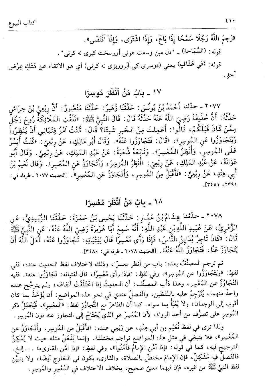 ثم ترجم المصنِّفُ بعده: باب من أنظر معسرًا، وذلك لاختلاف لفظ الحديث عنده، ففي لفظٍ: «ويَتَجَاوَزُوا عن المُوسِر»، وفي لفظٍ: «فإذا رأى مُعْسِرًا، قال لفتيانه: تَجَاوَزُوا عنه». ففيه التَّجَاوُزُ عن المُعْسِر، وهذا دَأْب المصنِّف: أن الحديثَ إذا اخْتَلَفَتْ ألفاظه، ولم يترجَّح عنده واحدٌ منهما، يُتَرْجِمُ عليه باللفظين، والفصلُ عندي في نحو هذه المواضع: أن يُؤْخَذَ بما كان أقرب إلى الوجدان، ولا يُعْبَأُ بما سواه. كما أن الظاهرَ مع التَّجاوُزِ لفظ: «المعْسِرِ»، فَيُحْمَلُ ذكر المُوسِرِ على تصرُّف من أحد الرواة، لأن المُعْسِرَ هو الذي يَحْتَاجُ إلى التجاوز عنه دون المُوسِر.