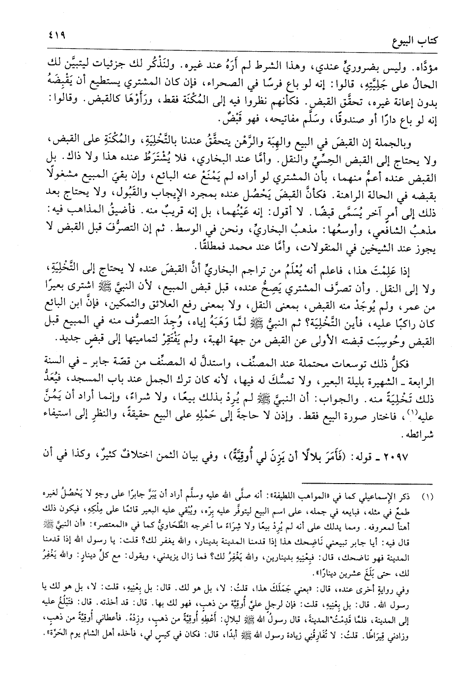 إذا عَلِمْتَ هذا، فاعلم أنه يُعْلَمُ من تراجم البخاريِّ أنَّ القبضَ عنده لا يحتاج إلى التَّخْلِيَةِ، ولا إلى النقل. وأن تصرَّف المشتري يَصِحُّ عنده، قبل قبض المبيع، لأن النبيَّ صلى الله عليه وسلّم اشترى بعيرًا من عمر، ولم يُوجَدْ منه القبض، بمعنى النقل، ولا بمعنى رفع العلائق والتمكين، فإنَّ ابن البائع كان راكبًا عليه، فأين التَّخْلِيَة؟ ثم النبيُّ صلى الله عليه وسلّم لمَّا وَهَبَهُ إياه، وُجِدَ التصرُّف منه في المبيع قبل القبض وحُوسِبَت قبضته الأولى عن القبض من جهة الهبة، ولم يَفْتَقِرْ لتماميتها إلى قبضٍ جديد.