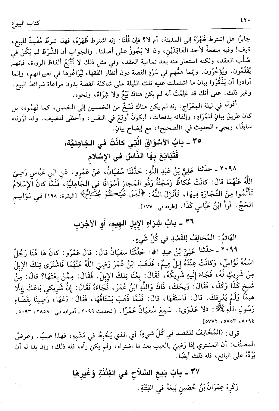جابرًا هل اشترط ظَهْرَهُ إلى المدينة، أم لا؟ فإن قُلْنَا: إنه اشترط ظَهْرَهُ، فهذا شرطٌ مُفْسِدٌ للبيع، كيف وفيه منفعةٌ لأحد العَاقِدَيْنِ، وذا لا يَجُوزُ على أصلنا. والجواب أن الشَّرْطَ لم يَكُنْ في صُلْب العقد، ولكنه استعار منه بعد تمامية العقد، وفي مثل ذلك لا تُتَّبَعُ ألفاظ الرواة، فإنهم يُقَدِّمُون، ويُؤَخِّرُون. وإنما همُّهم في سَرْدِ القصة دون أنظار الفقهاء ليُرَاعُوها في تعبيراتهم، وإنما أرادوا أن يَذْكُرُوا بيان ما اشتملت عليه تلك الليلة على شاكلة القصة بدون مراعاة شرائط البيع. وغير ذلك. على أنك قد عَلِمْتَ أنه لم يكن هناك بَيْعٌ ولا شِرَاءٌ، ونحوه.