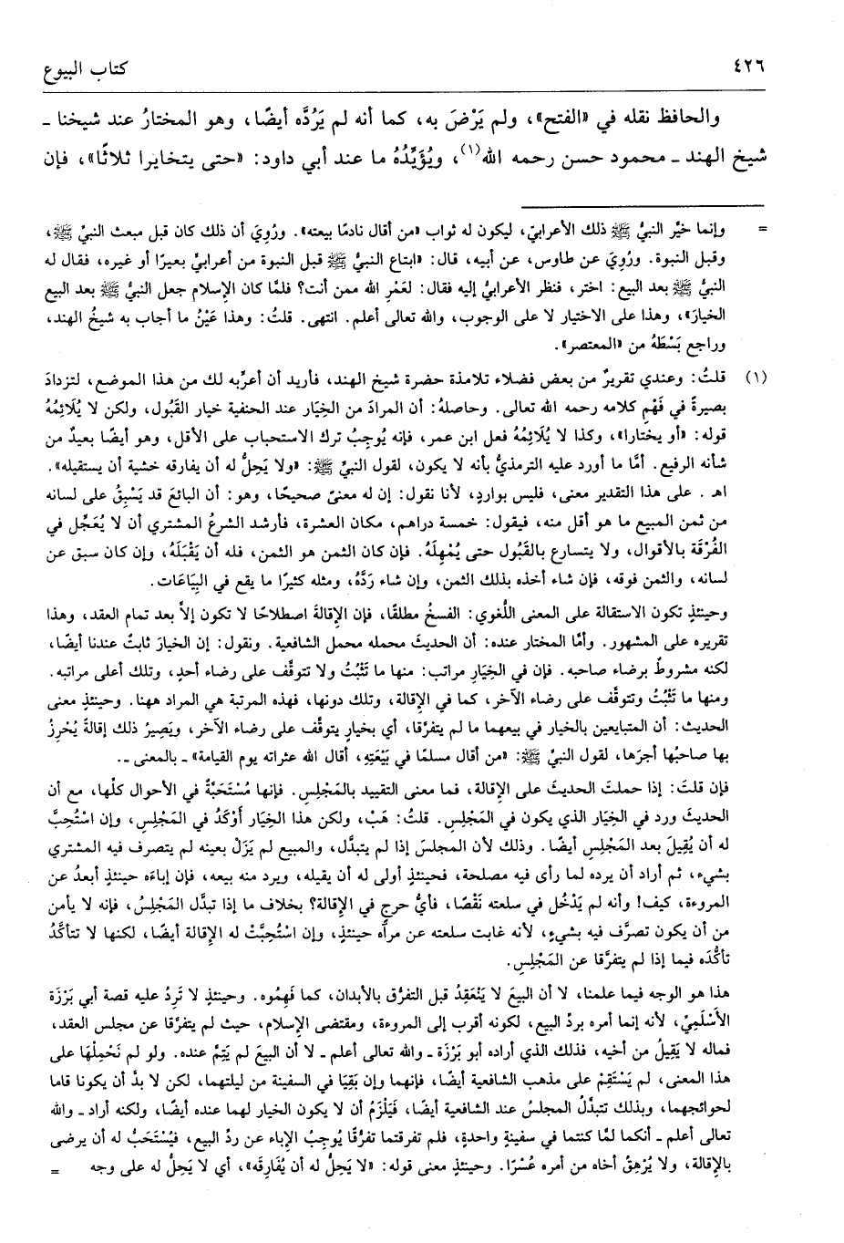 = وإنما خيَّر النبيُّ - صلى الله عليه وسلم - ذلك الأعرابي، ليكون له ثواب "من أقال نادمًا بيعته". ورُوِيَ أن ذلك كان قبل مبعث النبيِّ - صلى الله عليه وسلم -، وقبل النبوة. ورُوِيَ عن طاوس، عن أبيه، قال: "ابتاع النبي - صلى الله عليه وسلم - قبل النبوة من أعرابيٍّ بعيرًا أو غيره، فقال له النبيُّ - صلى الله عليه وسلم - بعد البيع: اختر، فنظر الأعرابيُّ إليه فقال: لعَمرِ الله ممن أنت؟ فلمَّا كان الإِسلام جعل النبيُّ - صلى الله عليه وسلم - بعد البيع الخيارَ"، وهذا على الاختيار لا على الوجوب، والله تعالى أعلم. انتهى. قلتُ: وهذا عَيْنُ ما أجاب به شيخُ الهند، وراجع بَسطَهُ من "المعتصر".