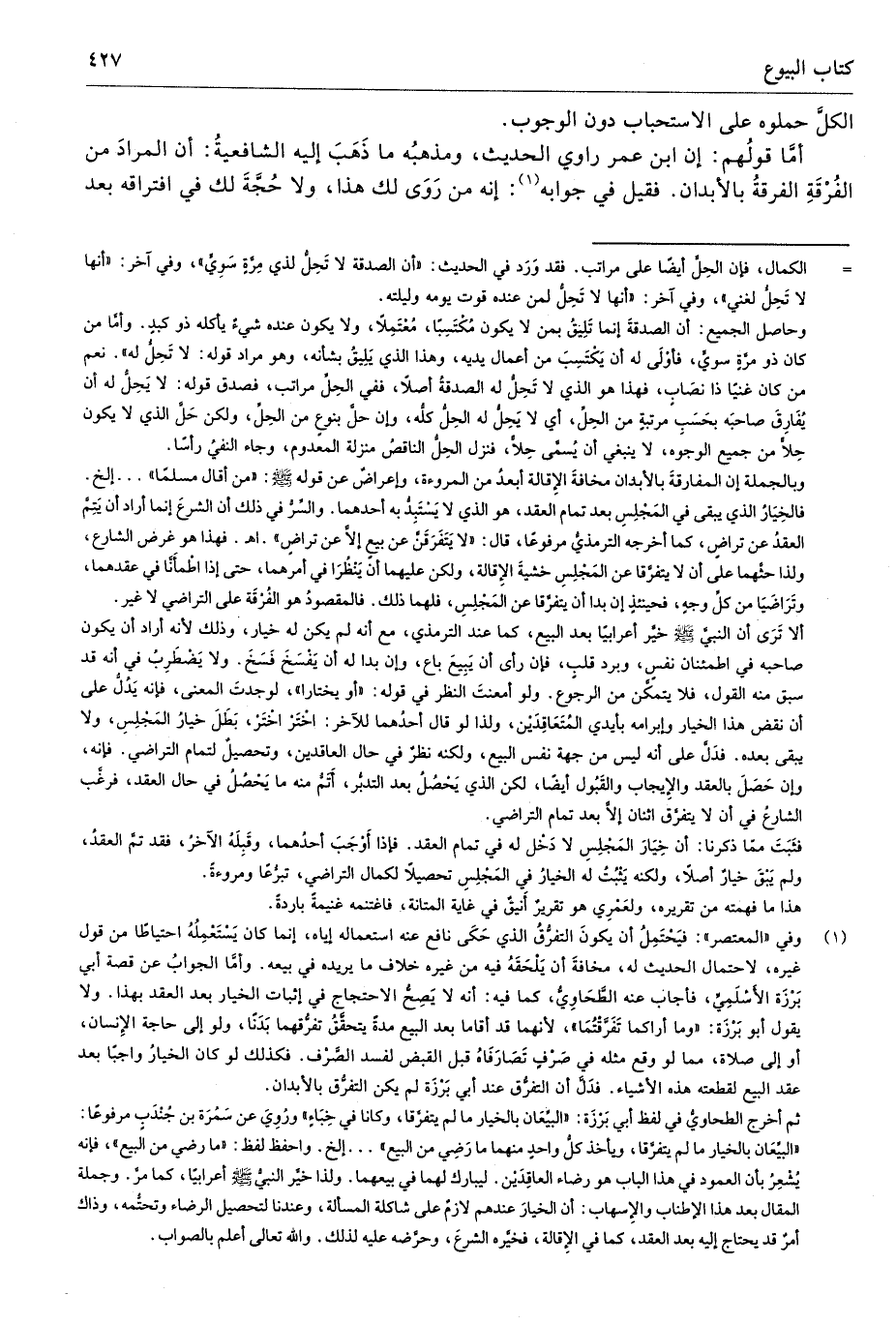 (¬1) وفي "المعتصر": فيَحْتَمِلُ أن يكونَ التفرُّقُ الذي حَكَى نافع عنه استعماله إياه، إنما كان يَستَعْمِلُهُ احتياطًا من قول غيره، لاحتمال الحديث له، مخافةَ أن يَلْحَقَهُ فيه من غيره خلاف ما يريده في بيعه. وأمَّا الجوابُ عن قصة أبي بَرْزَة الأسلَمِيِّ، فأجاب عنه الطَّحَاوِيُّ، كما فيه: أنه لا يَصِحُّ الاحتجاح في إثبات الخيار بعد العقد بهذا. ولا يقول أبو بَرْزَة: "وما أراكما تَفَرَّقْتُمَا"، لأنهما قد أقاما بعد البيع مدةً يتحقَّقُ تفرُّقهما بَدَنًا، ولو إلى حاجة الإِنسان، أو إلى صلاة، مما لو وقع مثله في صَرْفٍ تَصَارَفَاهُ قبل القبض لفسد الصَّرْف. فكذلك لو كان الخيارُ واجبًا بعد عقد البيع لقطعته هذه الأشياء. فدَلَّ أن التفرُّق عند أبي بَرْزَة لم يكن التفرُّق بالأبدان.