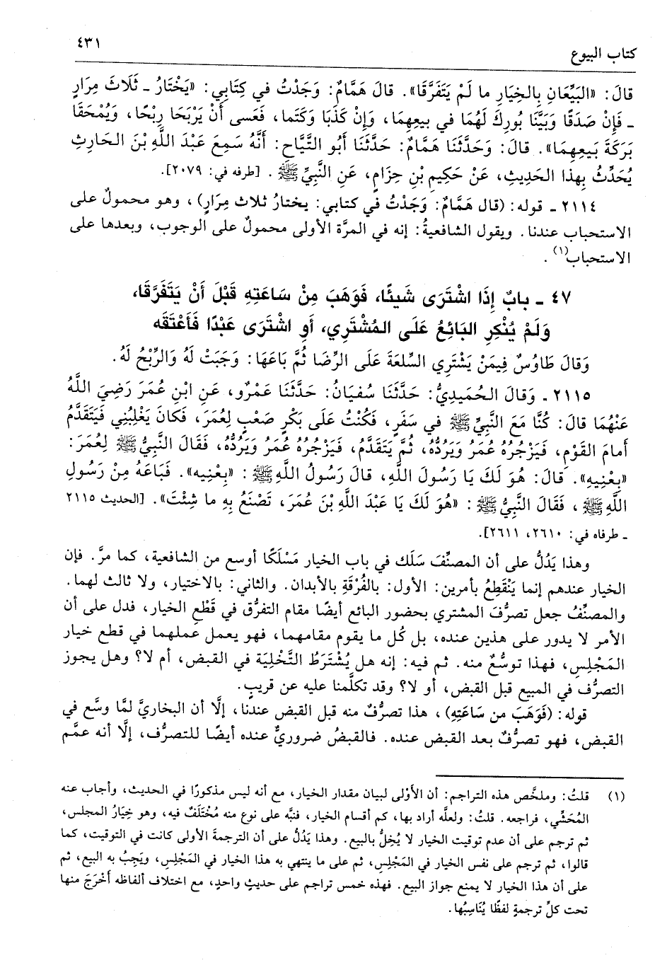 (¬1) قلتُ: وملخَّص هذه التراجم: أن الأَوْلى لبيان مقدار الخيار، مع أنه ليس مذكورًا في الحديث، وأجاب عنه المُحَشِّي، فراجعه. قلتُ: ولعلَّه أراد بها، كم أقسام الخيار، فنبَّه على نوع منه مُخْتَلَفٌ فيه، وهو خِيَارُ المجلس، ثم ترجم على أن عدم توقيت الخيار لا يُخِلُّ بالبيع. وهذا يَدُلُّ على أن الترجمةَ الأولى كانت في التوقيت، كما قالوا، ثم ترجم على نفس الخيار في المَجْلِسِ، ثم على ما ينتهي به هذا الخيار في المَجْلِسِ، وَيجِبُ به البيع، ثم على أن هذا الخيار لا يمنع جواز البيع. فهذه خمس تراجم على حديثٍ واحدٍ، مع اختلاف ألفاظه أَخْرَجَ منها تحت كل ترجمةٍ لفظًا يُنَاسِبُها.