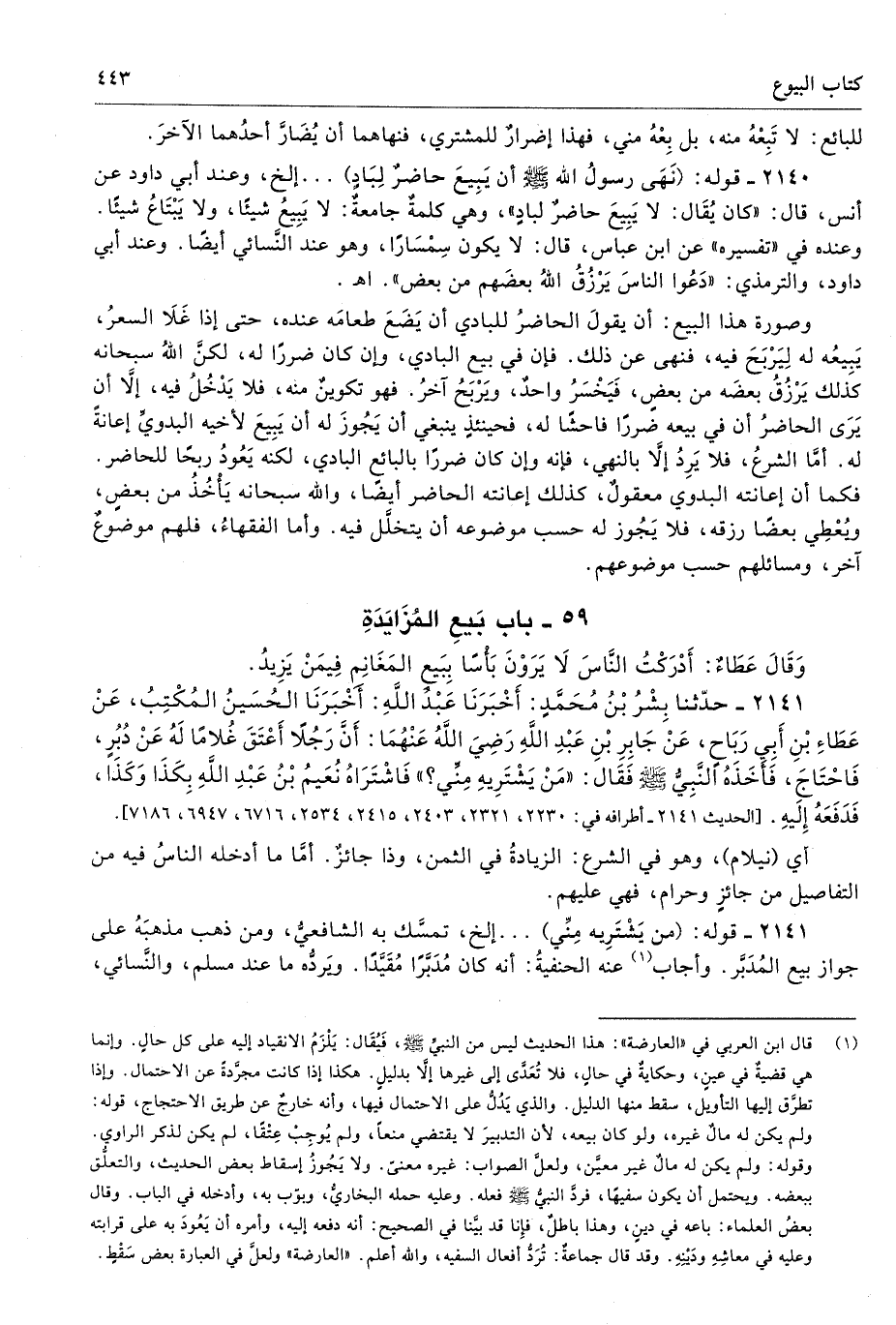 2140 - قوله: (نَهَى رسولُ الله صلى الله عليه وسلّم أن يَبِيعَ حاضرٌ لِبَادٍ) ... إلخ، وعند أبي داود عن أنس، قال: «كان يُقَال: لا يَبِيعَ حاضرٌ لبادٍ»، وهي كلمةٌ جامعةٌ: لا يَبِيعُ شيئًا، ولا يَبْتَاعُ شيئًا. وعنده في «تفسيره» عن ابن عباس، قال: لا يكون سِمْسَارًا، وهو عند النَّسائي أيضًا. وعند أبي داود، والترمذي: «دَعُوا الناسَ يَرْزُقُ اللهُ بعضَهم من بعض». اهـ.