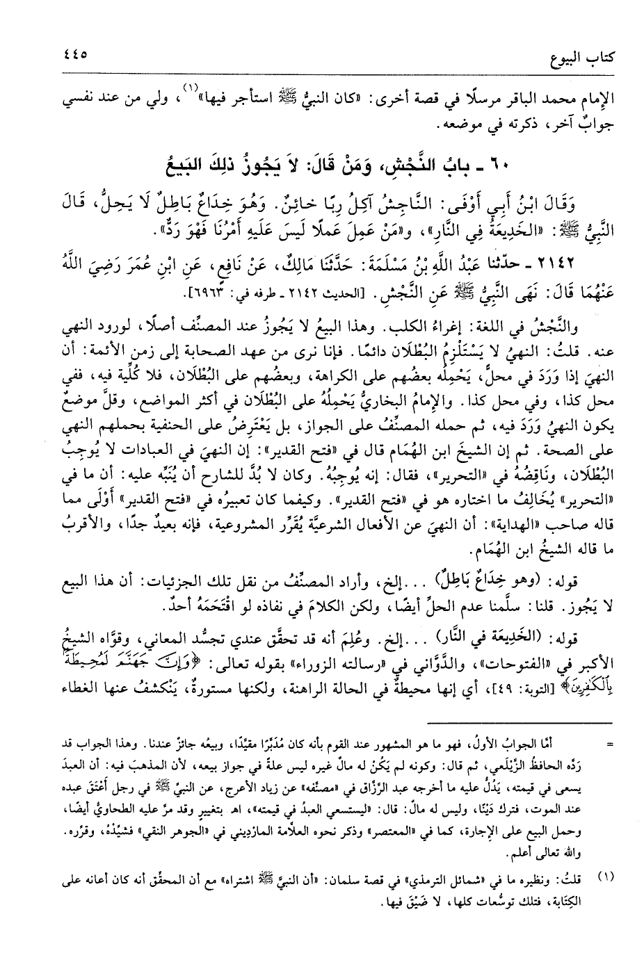 والنَّجْشُ في اللغة: إغراءُ الكلب. وهذا البيعُ لا يَجُوزُ عند المصنِّف أصلا، لورود النهي عنه. قلتُ: النهيُ لا يَسْتَلْزِمُ البُطْلان دائمًا. فإنا نرى من عهد الصحابة إلى زمن الأئمة: أن النهيَ إذا وَرَدَ في محلًّ، يَحْمِلُه بعضُهم على الكراهة، وبعضُهم على البُطْلان، فلا كُلِّية فيه، ففي محلًّ كذا، وفي محلًّ كذا. والإِمامُ البخاريُّ يَحْمِلُهُ على البُطْلان في أكثر المواضع، وقلَّ موضعٌ يكون النهيُ وَرَدَ فيه، ثم حمله المصنِّفُ على الجواز، بل يَعْتَرِضُ على الحنفية بحملهم النهي على الصحة. ثم إن الشيخَ ابن الهُمَام قال في «فتح القدير»: إن النهيَ في العبادات لا يُوجِبُ البُطْلان، ونَاقِضُهُ في «التحرير»، فقال: إنه يُوجِبُهُ. وكان لا بُدَّ للشارح أن يُنَبِّه عليه: أن ما في «التحرير» يُخَالِفُ ما اختاره في في «فتح القدير». وكيفما كان تعبيرُه في «فتح القدير» أَوْلَى مما قاله صاحب «الهداية»: أن النهيَ عن الأفعال الشرعيَّة يُقَرِّر المشروعية، فإنه بعيدٌ جدًا، والأقربُ ما قاله الشيخُ ابن الهُمَام.