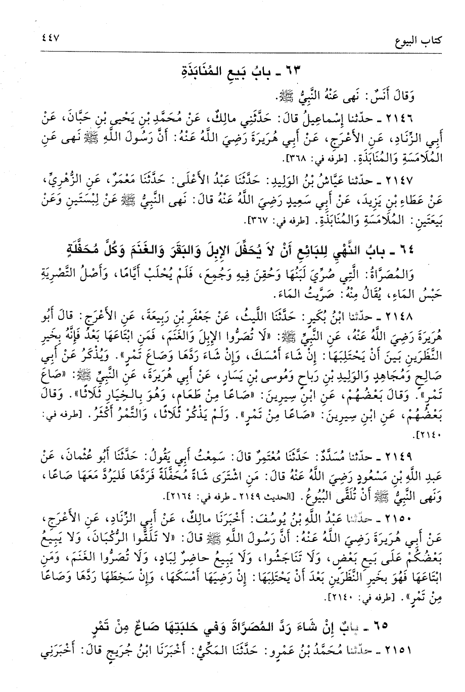 2150 - حَدَّثَنَا عَبْدُ اللَّهِ بْنُ يُوسُفَ أَخْبَرَنَا مَالِكٌ عَنْ أَبِى الزِّنَادِ عَنِ الأَعْرَجِ عَنْ أَبِى هُرَيْرَةَ - رضى الله عنه - أَنَّ رَسُولَ اللَّهِ - صلى الله عليه وسلم - قَالَ «لاَ تَلَقَّوُا الرُّكْبَانَ، وَلاَ يَبِيعُ بَعْضُكُمْ عَلَى بَيْعِ بَعْضٍ وَلاَ تَنَاجَشُوا وَلاَ يَبِيعُ حَاضِرٌ لِبَادٍ، وَلاَ تُصَرُّوا الْغَنَمَ، وَمَنِ ابْتَاعَهَا فَهْوَ بِخَيْرِ النَّظَرَيْنِ بَعْدَ أَنْ يَحْتَلِبَهَا إِنْ رَضِيَهَا أَمْسَكَهَا، وَإِنْ سَخِطَهَا رَدَّهَا وَصَاعًا مِنْ تَمْرٍ». أطرافه 2140، 2148، 2151، 2160، 2162، 2723، 2727، 5144، 5152، 6601 - تحفة 13802 - 93/ 3