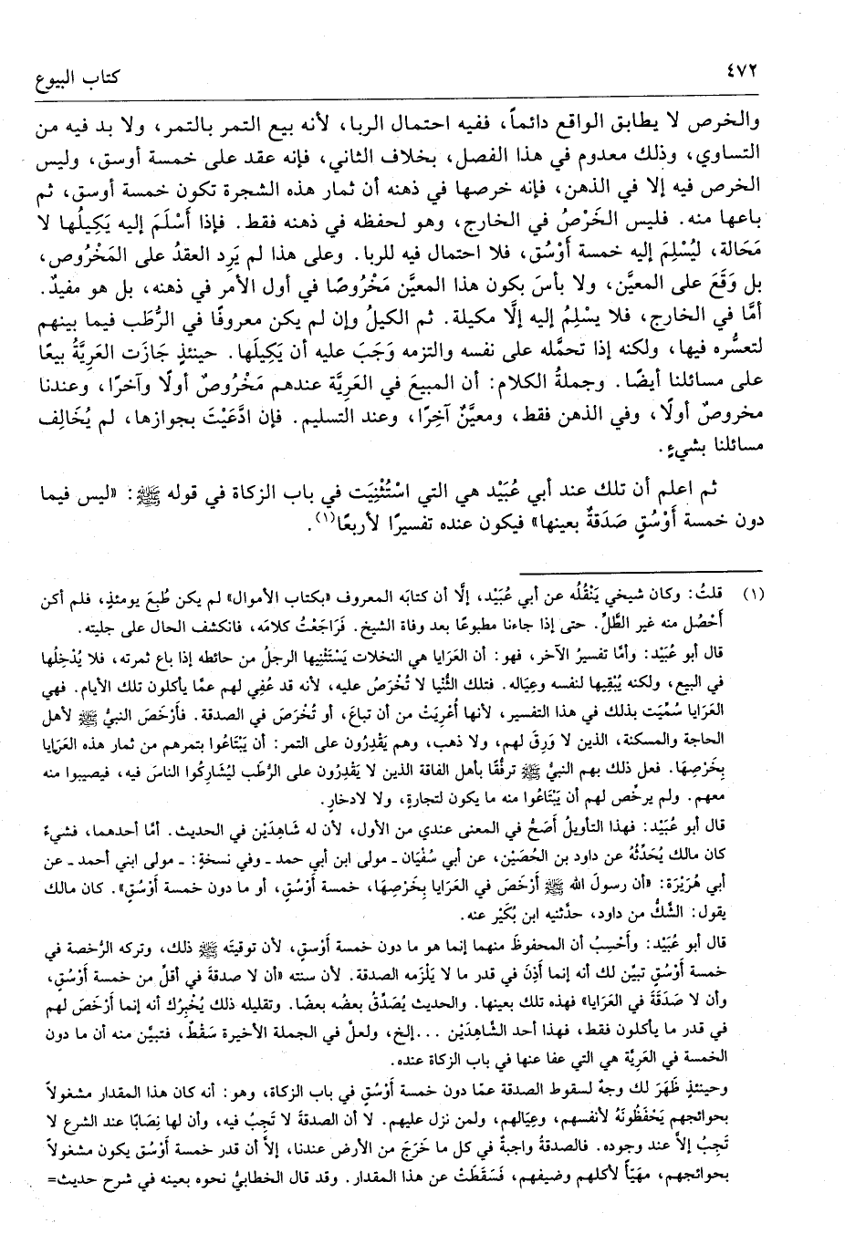 (¬1) قلتُ: وكان شيخي يَنْقُلُه عن أبي عُبَيد، إلَّا أن كتابَه المعروف "بكتاب الأموال" لم يكن طُبعَ يومئذٍ، فلم أكن أحْصُل منه غير الطَّلِّ. حتى إذا جاءنا مطبوعًا بعد وفاة الشيخ. فَرَاجَعْتُ كلامَه، فانكشف الحال على جليته.