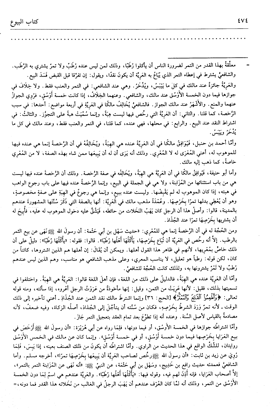 وأما أبو حنيفة، فَيُوافِقُ مالكًا في أن العَرِيَّةَ هي الهِبَةُ، ويُخَالِفُه في صفة الرُّخصةُ. وذلك أن الرُّخصةَ عنده فيها ليست هي من باب استثنائها من المُزَابنة، ولا هي في الجملة في البيع، وإنما الرُّخصةُ عنده فيها على باب رجوع الواهب في هبته، إذا كان الموهوب له لم يَقبِضْها. وليست عنده ببيع، وإنما هي رجوعٌ في الهِبَةِ على صفةٍ مخصوصةٍ، وهو أن يُعْطِي بدلها تمرًا بِخَرْصِهَا. وعُمْدَةُ مذهب مالك في العَرِيَّة: أنها بالصفة التي ذَكَرَ سُنَّتَها المشهورةَ عندهم بالمدينة، قالوا: وأصلُ هذا أن الرجل كان يَهَبُ النَخَلات من حائطه، فَيَشُقُّ عليه دخول الموهوب له عليه، فأُبِيحَ له أن يشتريها بِخَرْصِهَا تمرًا عند الجُذَاذ.