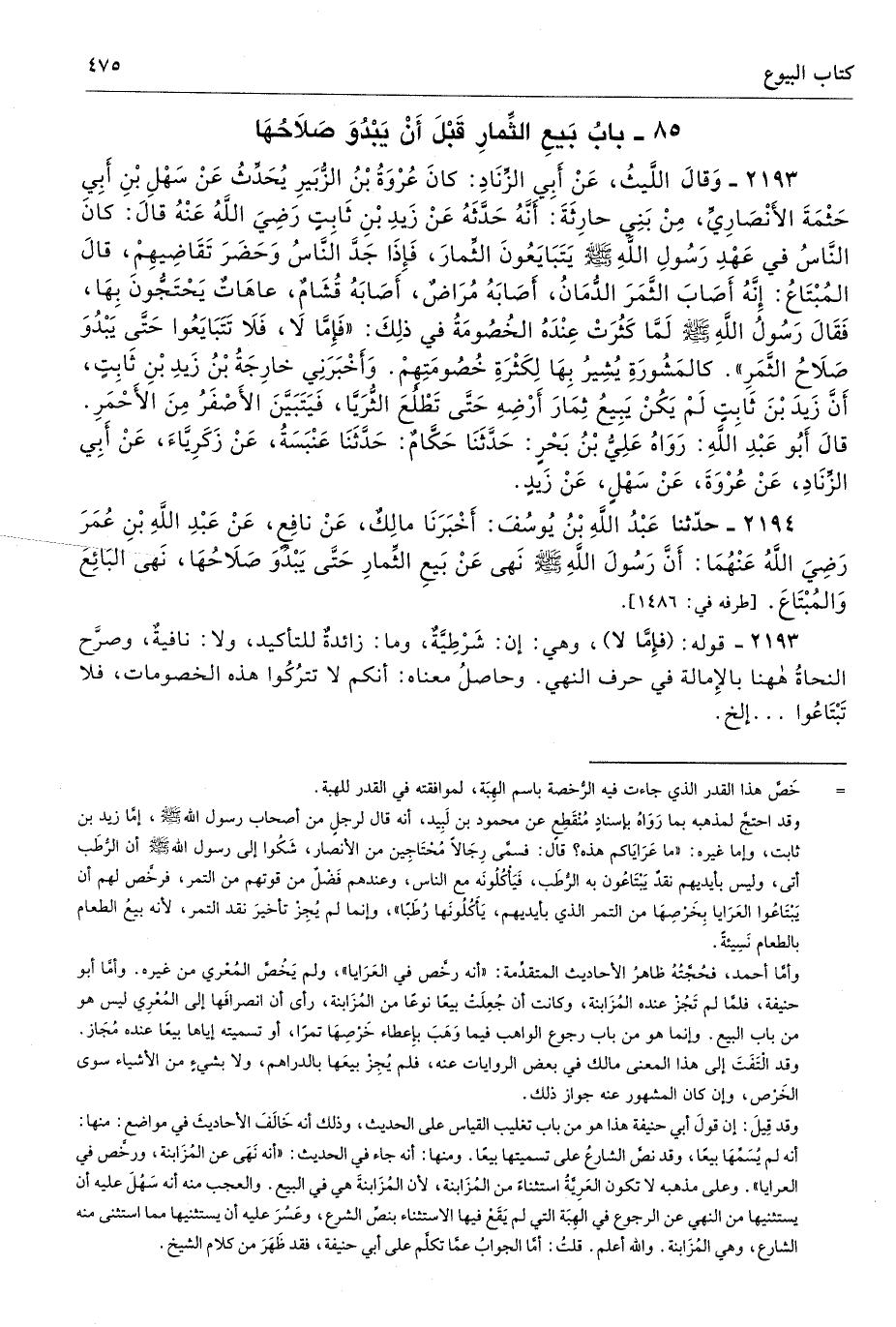 2194 - حَدَّثَنَا عَبْدُ اللَّهِ بْنُ يُوسُفَ أَخْبَرَنَا مَالِكٌ عَنْ نَافِعٍ عَنْ عَبْدِ اللَّهِ بْنِ عُمَرَ - رضى الله عنهما - أَنَّ رَسُولَ اللَّهِ - صلى الله عليه وسلم - نَهَى عَنْ بَيْعِ الثِّمَارِ حَتَّى يَبْدُوَ صَلاَحُهَا، نَهَى الْبَائِعَ وَالْمُبْتَاعَ. أطرافه 1486، 2183، 2199، 2247، 2249 - تحفة 8355 - 101/ 3