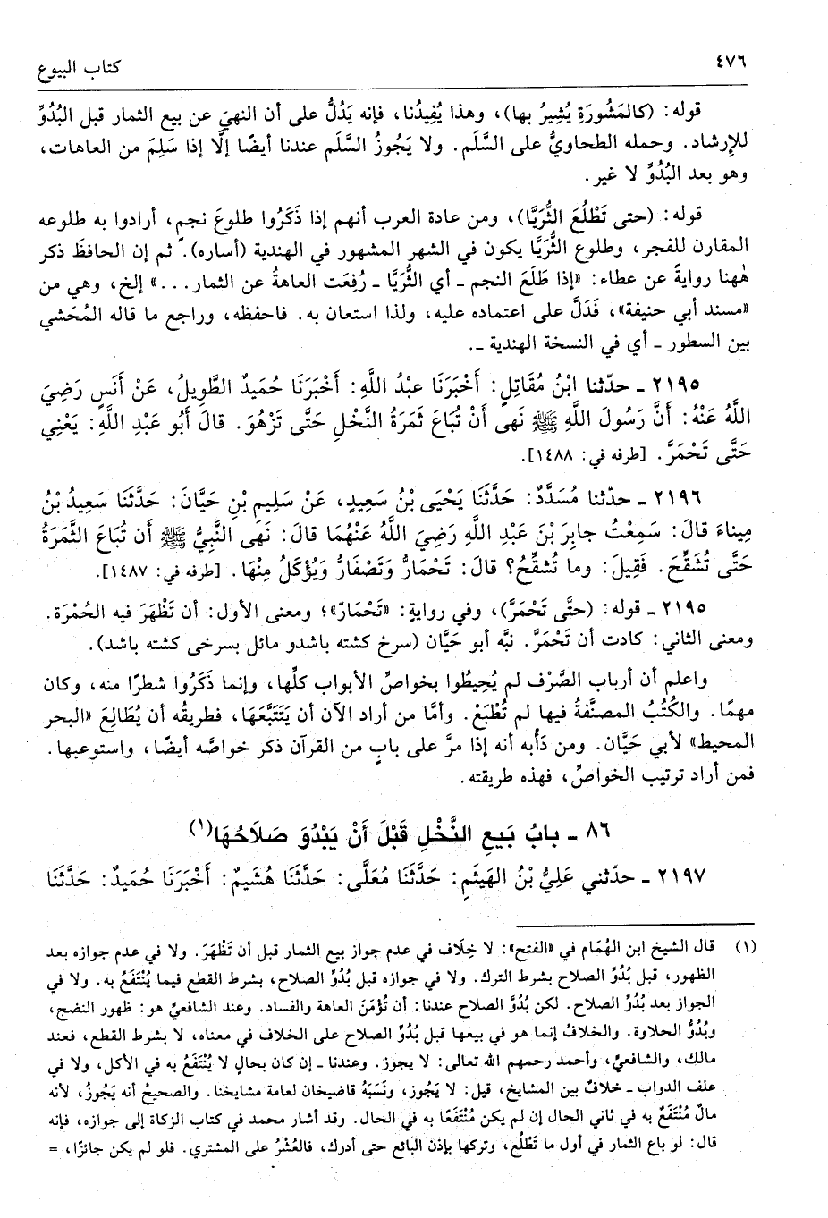 2195 - حَدَّثَنَا ابْنُ مُقَاتِلٍ أَخْبَرَنَا عَبْدُ اللَّهِ أَخْبَرَنَا حُمَيْدٌ الطَّوِيلُ عَنْ أَنَسٍ - رضى الله عنه - أَنَّ رَسُولَ اللَّهِ - صلى الله عليه وسلم - نَهَى أَنْ تُبَاعَ ثَمَرَةُ النَّخْلِ حَتَّى تَزْهُوَ. قَالَ أَبُو عَبْدِ اللَّهِ يَعْنِى حَتَّى تَحْمَرَّ. أطرافه 1488، 2197، 2198، 2208 - تحفة 710