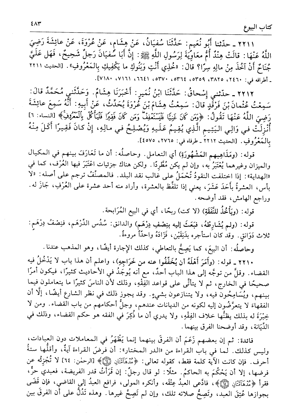 2212 - حَدَّثَنِى إِسْحَاقُ حَدَّثَنَا ابْنُ نُمَيْرٍ أَخْبَرَنَا هِشَامٌ وَحَدَّثَنِى مُحَمَّدٌ قَالَ سَمِعْتُ عُثْمَانَ بْنَ فَرْقَدٍ قَالَ سَمِعْتُ هِشَامَ بْنَ عُرْوَةَ يُحَدِّثُ عَنْ أَبِيهِ أَنَّهُ سَمِعَ عَائِشَةَ - رضى الله عنها - تَقُولُ {وَمَنْ كَانَ غَنِيًّا فَلْيَسْتَعْفِفْ وَمَنْ كَانَ فَقِيرًا فَلْيَأْكُلْ بِالْمَعْرُوفِ} [النساء: 6] أُنْزِلَتْ فِى وَالِى الْيَتِيمِ الَّذِى يُقِيمُ عَلَيْهِ، وَيُصْلِحُ فِى مَالِهِ، إِنْ كَانَ فَقِيرًا أَكَلَ مِنْهُ بِالْمَعْرُوفِ. طرفاه 2765، 4575 - تحفة 16980، 17099 - 104/ 3