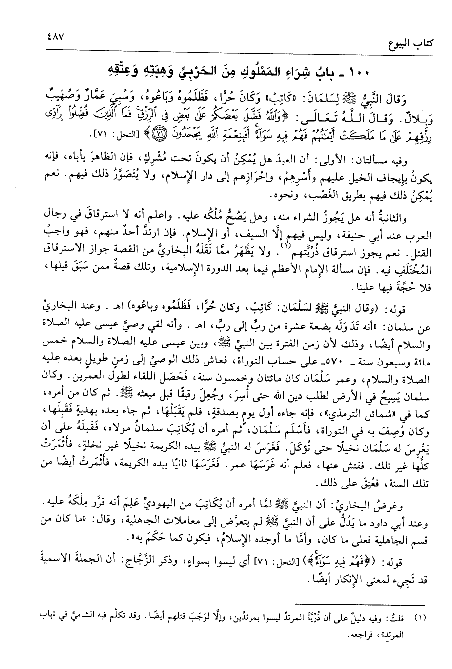 وَقَالَ النَّبِىُّ - صلى الله عليه وسلم - لِسَلْمَانَ كَاتِبْ. وَكَانَ حُرًّا فَظَلَمُوهُ وَبَاعُوهُ. وَسُبِىَ عَمَّارٌ وَصُهَيْبٌ وَبِلاَلٌ، وَقَالَ اللَّهُ تَعَالَى: {وَاللَّهُ فَضَّلَ بَعْضَكُمْ عَلَى بَعْضٍ فِي الرِّزْقِ فَمَا الَّذِينَ فُضِّلُوا بِرَادِّي رِزْقِهِمْ عَلَى مَا مَلَكَتْ أَيْمَانُهُمْ فَهُمْ فِيهِ سَوَاءٌ أَفَبِنِعْمَةِ اللَّهِ يَجْحَدُونَ (71)} [النحل: 71].