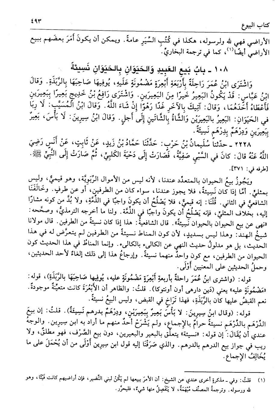قوله: (واشترى ابنُ عُمَرَ راحلةً بأربعةِ أَبْعِرَةٍ مَضْمُونَةٍ عليه، يُوفِيها صَاحِبَهَا بالرَّبَذَةِ)، قوله: «مَضْمُونَةٍ عليه» يعني (دَين دارهى أون أونتوكا). قلتُ: والظاهر أن الأَبْعُرَةَ كانت متعيِّنةً موجودةً. نعم القبضُ عليها كان بالرَّبَذَةِ، فهذا تَرَاخٍ في القبض، وليس البيعُ نسيئةً.