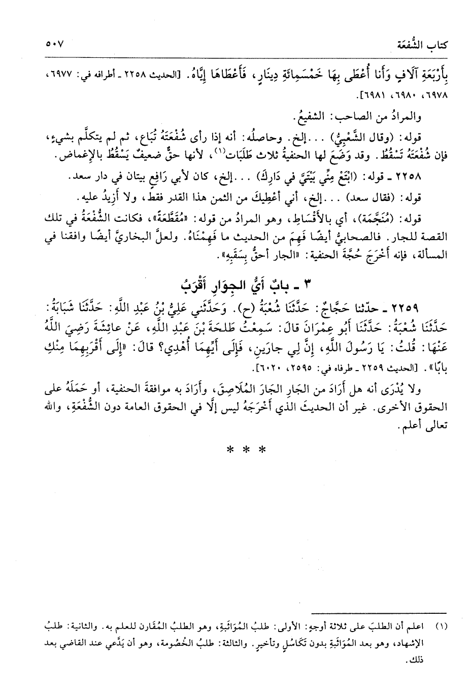 ولا يُدْرَى أنه هل أَرَادَ من الجَارِ الجَارَ المُلاصِقَ، وأَرَادَ به موافقةَ الحنفية، أو حَمَلَهُ على الحقوق الأخرى. غير أن الحديثَ الذي أَخْرَجَهُ ليس إلا في الحقوق العامة دون الشُّفْعَةِ، والله تعالى أعلم.