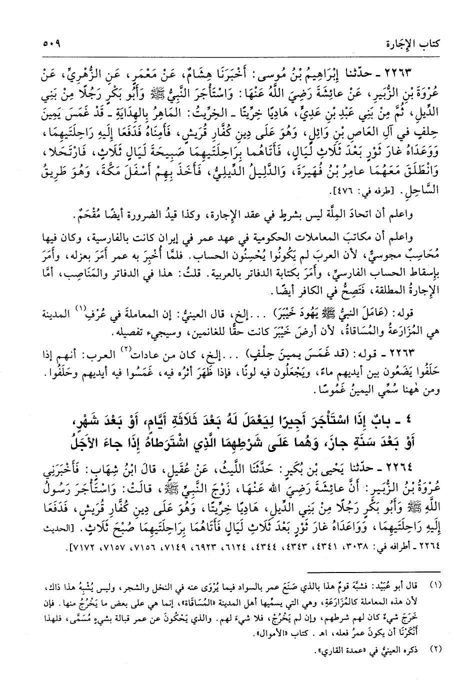 2264 - حَدَّثَنَا يَحْيَى بْنُ بُكَيْرٍ حَدَّثَنَا اللَّيْثُ عَنْ عُقَيْلٍ قَالَ ابْنُ شِهَابٍ فَأَخْبَرَنِى عُرْوَةُ بْنُ الزُّبَيْرِ أَنَّ عَائِشَةَ - رضى الله عنها - زَوْجَ النَّبِىِّ - صلى الله عليه وسلم - قَالَتْ وَاسْتَأْجَرَ رَسُولُ اللَّهِ - صلى الله عليه وسلم - وَأَبُو بَكْرٍ رَجُلًا مِنْ بَنِى الدِّيلِ، هَادِيًا خِرِّيتًا وَهْوَ عَلَى دِينِ كُفَّارِ قُرَيْشٍ، فَدَفَعَا إِلَيْهِ رَاحِلَتَيْهِمَا، وَوَاعَدَاهُ غَارَ ثَوْرٍ بَعْدَ ثَلاَثِ لَيَالٍ بِرَاحِلَتَيْهِمَا صُبْحَ ثَلاَثٍ. أطرافه 476، 2138، 2263، 2297، 3905، 4093، 5807، 6079 - تحفة 16552