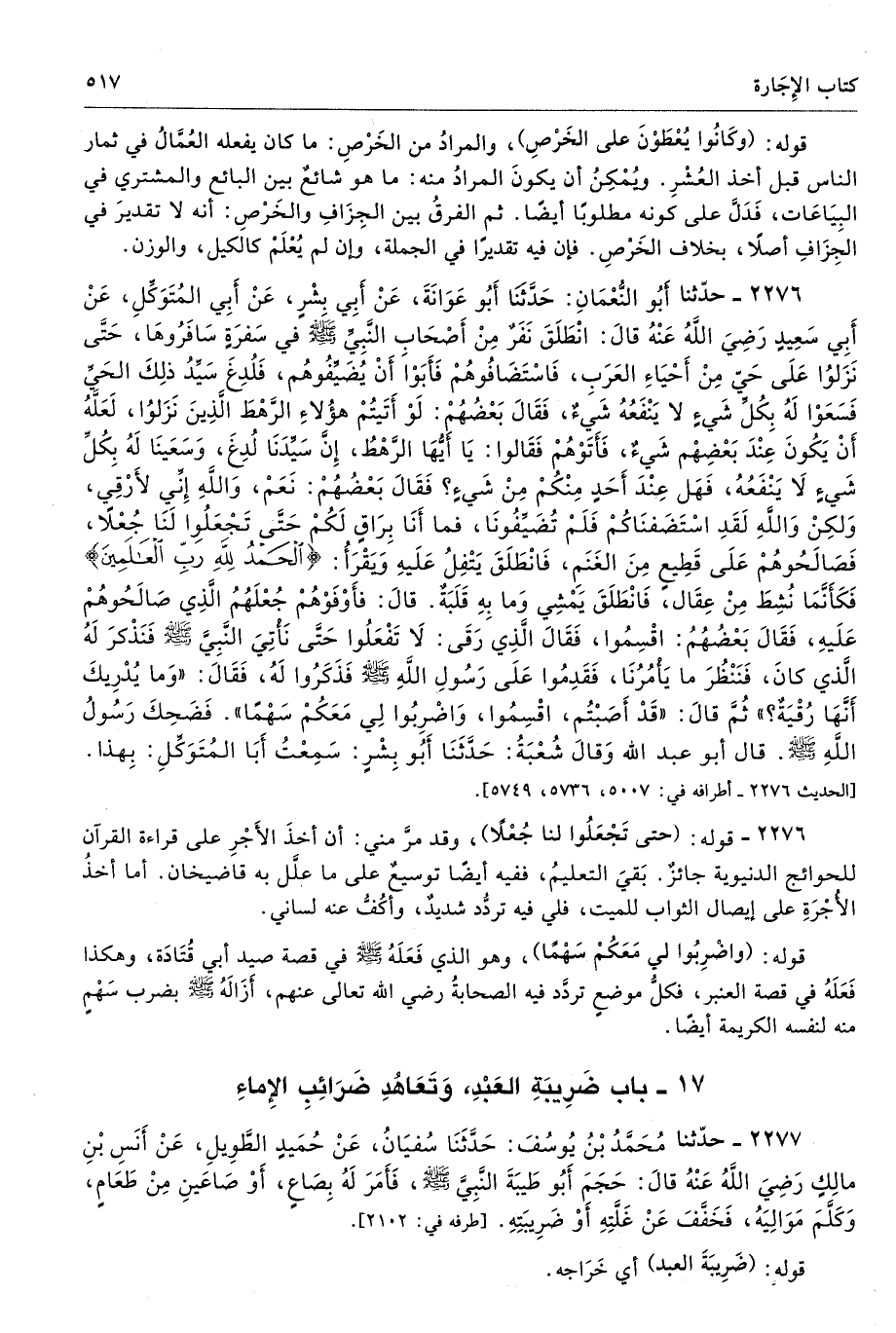 2277 - حَدَّثَنَا مُحَمَّدُ بْنُ يُوسُفَ حَدَّثَنَا سُفْيَانُ عَنْ حُمَيْدٍ الطَّوِيلِ عَنْ أَنَسِ بْنِ مَالِكٍ - رضى الله عنه - قَالَ حَجَمَ أَبُو طَيْبَةَ النَّبِىَّ - صلى الله عليه وسلم -، فَأَمَرَ لَهُ بِصَاعٍ أَوْ صَاعَيْنِ مِنْ طَعَامٍ، وَكَلَّمَ مَوَالِيَهُ فَخَفَّفَ عَنْ غَلَّتِهِ أَوْ ضَرِيبَتِهِ. أطرافه 2102، 2210، 2280، 2281، 5696 - تحفة 676 - 122/ 3