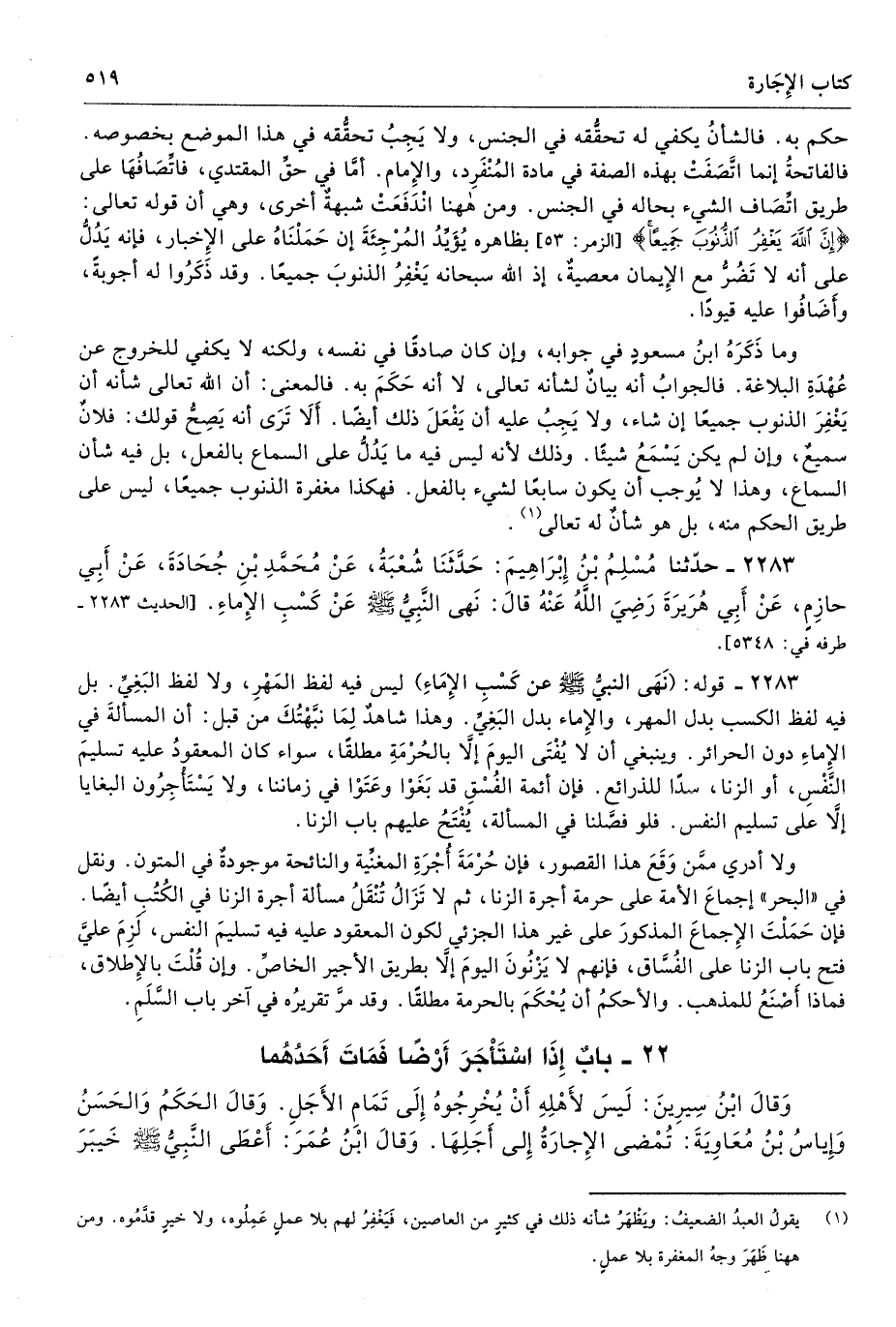 ولا أدري ممَّن وَقَعَ هذا القصور، فإن حُرْمَةَ أُجْرَةِ المغنِّية والنائحة موجودةٌ في المتون. ونقل في «البحر» إجماعَ الأمة على حرمة أجرة الزنا، ثم لا تَزَالُ تُنْقَلُ مسألة أجرة الزنا في الكُتُبِ أيضًا. فإن حَمَلْتَ الإِجماعَ المذكورَ على غير هذا الجزئي لكون المعقودُ عليه فيه تسليمَ النفس، لَزِمَ عليَّ فتح باب الزنا على الفُسَّاق، فإنهم لا يَزْنُونَ اليومَ إلا بطريق الأجير الخاصِّ. وإن قُلْتَ بالإِطلاق، فماذا أَصْنَعُ للمذهب. والأحكمُ أن يُحْكَمَ بالحرمة مطلقًا. وقد مرَّ تقريرُه في آخر باب السَّلَمِ.