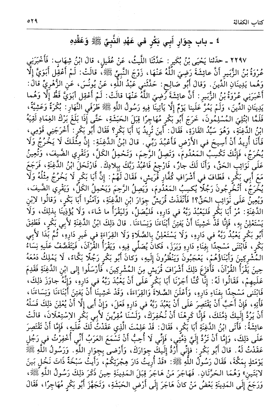 2297 - حَدَّثَنَا يَحْيَى بْنُ بُكَيْرٍ حَدَّثَنَا اللَّيْثُ عَنْ عُقَيْلٍ قَالَ ابْنُ شِهَابٍ فَأَخْبَرَنِى عُرْوَةُ بْنُ الزُّبَيْرِ أَنَّ عَائِشَةَ - رضى الله عنها - زَوْجَ النَّبِىِّ - صلى الله عليه وسلم - قَالَتْ لَمْ أَعْقِلْ أَبَوَىَّ إِلاَّ وَهُمَا يَدِينَانِ الدِّينَ. وَقَالَ أَبُو صَالِحٍ حَدَّثَنِى عَبْدُ اللَّهِ عَنْ يُونُسَ عَنِ الزُّهْرِىِّ قَالَ أَخْبَرَنِى عُرْوَةُ بْنُ الزُّبَيْرِ أَنَّ عَائِشَةَ - رضى الله عنها - قَالَتْ لَمْ أَعْقِلْ أَبَوَىَّ قَطُّ، إِلاَّ وَهُمَا يَدِينَانِ الدِّينَ، وَلَمْ يَمُرَّ عَلَيْنَا يَوْمٌ إِلاَّ يَأْتِينَا فِيهِ رَسُولُ اللَّهِ - صلى الله عليه وسلم - طَرَفَىِ النَّهَارِ بُكْرَةً وَعَشِيَّةً، فَلَمَّا ابْتُلِىَ الْمُسْلِمُونَ خَرَجَ أَبُو بَكْرٍ مُهَاجِرًا قِبَلَ الْحَبَشَةِ، حَتَّى إِذَا بَلَغَ بَرْكَ الْغِمَادِ لَقِيَهُ ابْنُ الدَّغِنَةِ - وَهْوَ سَيِّدُ الْقَارَةِ - فَقَالَ أَيْنَ تُرِيدُ يَا أَبَا بَكْرٍ فَقَالَ أَبُو بَكْرٍ أَخْرَجَنِى قَوْمِى فَأَنَا أُرِيدُ أَنْ أَسِيحَ فِى الأَرْضِ فَأَعْبُدَ رَبِّى. قَالَ ابْنُ الدَّغِنَةِ إِنَّ مِثْلَكَ لاَ يَخْرُجُ وَلاَ يُخْرَجُ، فَإِنَّكَ تَكْسِبُ الْمَعْدُومَ، وَتَصِلُ الرَّحِمَ، وَتَحْمِلُ الْكَلَّ، وَتَقْرِى الضَّيْفَ، وَتُعِينُ عَلَى نَوَائِبِ الْحَقِّ، وَأَنَا لَكَ جَارٌ فَارْجِعْ فَاعْبُدْ رَبَّكَ بِبِلاَدِكَ. فَارْتَحَلَ ابْنُ الدَّغِنَةِ، فَرَجَعَ مَعَ أَبِى بَكْرٍ، فَطَافَ فِى أَشْرَافِ كُفَّارِ قُرَيْشٍ، فَقَالَ لَهُمْ إِنَّ أَبَا بَكْرٍ لاَ يَخْرُجُ مِثْلُهُ، وَلاَ يُخْرَجُ، أَتُخْرِجُونَ رَجُلاً يُكْسِبُ الْمَعْدُومَ، وَيَصِلُ الرَّحِمَ، وَيَحْمِلُ الْكَلَّ، وَيَقْرِى الضَّيْفَ، وَيُعِينُ عَلَى نَوَائِبِ الْحَقِّ. فَأَنْفَذَتْ قُرَيْشٌ جِوَارَ ابْنِ الدَّغِنَةِ وَآمَنُوا أَبَا بَكْرٍ وَقَالُوا لاِبْنِ الدَّغِنَةِ مُرْ أَبَا بَكْرٍ فَلْيَعْبُدْ رَبَّهُ فِى دَارِهِ، فَلْيُصَلِّ وَلْيَقْرَأْ مَا شَاءَ، وَلاَ يُؤْذِينَا بِذَلِكَ، وَلاَ يَسْتَعْلِنْ بِهِ، فَإِنَّا قَدْ خَشِينَا أَنْ يَفْتِنَ أَبْنَاءَنَا وَنِسَاءَنَا. قَالَ ذَلِكَ ابْنُ الدَّغِنَةِ لأَبِى بَكْرٍ، فَطَفِقَ أَبُو بَكْرٍ يَعْبُدُ رَبَّهُ فِى دَارِهِ، وَلاَ يَسْتَعْلِنُ بِالصَّلاَةِ وَلاَ الْقِرَاءَةِ فِى غَيْرِ دَارِهِ، ثُمَّ بَدَا لأَبِى بَكْرٍ فَابْتَنَى مَسْجِدًا بِفِنَاءِ دَارِهِ، وَبَرَزَ فَكَانَ يُصَلِّى فِيهِ، وَيَقْرَأُ الْقُرْآنَ، فَيَتَقَصَّفُ عَلَيْهِ نِسَاءُ الْمُشْرِكِينَ وَأَبْنَاؤُهُمْ، يَعْجَبُونَ وَيَنْظُرُونَ إِلَيْهِ، وَكَانَ أَبُو بَكْرٍ رَجُلاً بَكَّاءً لاَ يَمْلِكُ دَمْعَهُ حِينَ يَقْرَأُ الْقُرْآنَ، فَأَفْزَعَ ذَلِكَ أَشْرَافَ قُرَيْشٍ مِنَ الْمُشْرِكِينَ، فَأَرْسَلُوا إِلَى ابْنِ الدَّغِنَةِ فَقَدِمَ عَلَيْهِمْ، فَقَالُوا لَهُ إِنَّا كُنَّا أَجَرْنَا أَبَا بَكْرٍ عَلَى أَنْ يَعْبُدَ رَبَّهُ فِى دَارِهِ، وَإِنَّهُ جَاوَزَ ذَلِكَ، فَابْتَنَى مَسْجِدًا بِفِنَاءِ دَارِهِ، وَأَعْلَنَ الصَّلاَةَ وَالْقِرَاءَةَ، وَقَدْ خَشِينَا أَنْ يَفْتِنَ أَبْنَاءَنَا وَنِسَاءَنَا، فَأْتِهِ فَإِنْ أَحَبَّ أَنْ يَقْتَصِرَ عَلَى أَنْ يَعْبُدَ رَبَّهُ فِى دَارِهِ فَعَلَ، وَإِنْ أَبَى إِلاَّ أَنْ يُعْلِنَ ذَلِكَ فَسَلْهُ أَنْ يَرُدَّ إِلَيْكَ ذِمَّتَكَ، فَإِنَّا كَرِهْنَا أَنْ نُخْفِرَكَ، وَلَسْنَا مُقِرِّينَ لأَبِى بَكْرٍ الاِسْتِعْلاَنَ. قَالَتْ عَائِشَةُ فَأَتَى ابْنُ الدَّغِنَةِ أَبَا بَكْرٍ، فَقَالَ قَدْ عَلِمْتَ الَّذِى عَقَدْتُ لَكَ عَلَيْهِ، فَإِمَّا أَنْ تَقْتَصِرَ عَلَى ذَلِكَ وَإِمَّا أَنْ تَرُدَّ إِلَىَّ ذِمَّتِى، فَإِنِّى لاَ أُحِبُّ أَنْ تَسْمَعَ الْعَرَبُ أَنِّى أُخْفِرْ