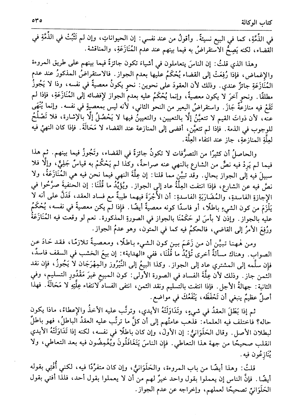وهذا الذي قلتُ: إن الناسَ يتعاملون في أشياءَ تكون جائزةً فيما بينهم على طريق المروءة والإِغماض، فإذا رُفِعَتْ إلى القضاء يُحْكَمُ عليها بعدم الجواز. فالاستقراضُ المذكورُ عند عدم المُنَازَعَةِ جائزٌ عندي. وذلك لأن العقودَ على نحوين: نحوٍ يكونُ معصيةً في نفسه، وذا لا يَجُوزُ مطلقًا. ونحوٍ آخرَ لا يكون معصيةً، وإنما يُحْكَمُ عليه بعدم الجواز لإِفضائه إلى المُنَازَعَةِ، فإذا لم تَقَعْ فيه منازعةٌ جَازَ. واستقراضُ البعير من النحو الثاني، لأنه ليس بمعصيةٍ في نفسه. وإنما يُنْهَى عنه، لأن ذواتَ القيم لا تتعيَّنُ إلا بالتعيين، والتعيينُ فيها لا يَحْصُلُ إلا بالإبشارة، فلا تَصْلُحُ للوجوب في الذمة. فإذا لم تتعيَّن، أفضى إلى المنازعة عند القضاء لا مَحَالَةَ. فإذا كان النهيُ فيه لعِلَّةِ المنازعةِ، جاز عند انتفاء العِلَّة.