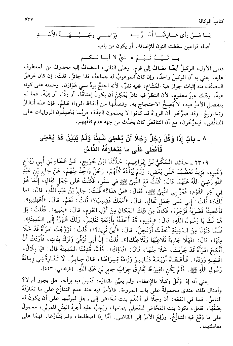 2309 - حَدَّثَنَا الْمَكِّىُّ بْنُ إِبْرَاهِيمَ حَدَّثَنَا ابْنُ جُرَيْجٍ عَنْ عَطَاءِ بْنِ أَبِى رَبَاحٍ وَغَيْرِهِ، يَزِيدُ بَعْضُهُمْ عَلَى بَعْضٍ، وَلَمْ يُبَلِّغْهُ كُلُّهُمْ رَجُلٌ وَاحِدٌ مِنْهُمْ عَنْ جَابِرِ بْنِ عَبْدِ اللَّهِ - رضى الله عنهما - قَالَ كُنْتُ مَعَ النَّبِىِّ - صلى الله عليه وسلم - فِى سَفَرٍ، فَكُنْتُ عَلَى جَمَلٍ ثَفَالٍ، إِنَّمَا هُوَ فِى آخِرِ الْقَوْمِ، فَمَرَّ بِى النَّبِىُّ - صلى الله عليه وسلم - فَقَالَ «مَنْ هَذَا». قُلْتُ جَابِرُ بْنُ عَبْدِ اللَّهِ. قَالَ «مَا لَكَ». قُلْتُ إِنِّى عَلَى جَمَلٍ ثَفَالٍ. قَالَ «أَمَعَكَ قَضِيبٌ». قُلْتُ نَعَمْ. قَالَ «أَعْطِنِيهِ». فَأَعْطَيْتُهُ فَضَرَبَهُ فَزَجَرَهُ، فَكَانَ مِنْ ذَلِكَ الْمَكَانِ مِنْ أَوَّلِ الْقَوْمِ قَالَ «بِعْنِيهِ». فَقُلْتُ بَلْ هُوَ لَكَ يَا رَسُولَ اللَّهِ. قَالَ «بِعْنِيهِ قَدْ أَخَذْتُهُ بِأَرْبَعَةِ دَنَانِيرَ، وَلَكَ ظَهْرُهُ إِلَى الْمَدِينَةِ». فَلَمَّا دَنَوْنَا مِنَ الْمَدِينَةِ أَخَذْتُ أَرْتَحِلُ. قَالَ «أَيْنَ تُرِيدُ». قُلْتُ تَزَوَّجْتُ امْرَأَةً قَدْ خَلاَ مِنْهَا. قَالَ «فَهَلاَّ جَارِيَةً تُلاَعِبُهَا وَتُلاَعِبُكَ». قُلْتُ إِنَّ أَبِى تُوُفِّىَ وَتَرَكَ بَنَاتٍ، فَأَرَدْتُ أَنْ أَنْكِحَ امْرَأَةً قَدْ جَرَّبَتْ خَلاَ مِنْهَا. قَالَ «فَذَلِكَ». فَلَمَّا قَدِمْنَا الْمَدِينَةَ قَالَ «يَا بِلاَلُ اقْضِهِ وَزِدْهُ». فَأَعْطَاهُ أَرْبَعَةَ دَنَانِيرَ، وَزَادَهُ قِيرَاطًا. قَالَ جَابِرٌ لاَ تُفَارِقُنِى زِيَادَةُ رَسُولِ اللَّهِ - صلى الله عليه وسلم -. فَلَمْ يَكُنِ الْقِيرَاطُ يُفَارِقُ جِرَابَ جَابِرِ بْنِ عَبْدِ اللَّهِ. أطرافه 443، 1801، 2097، 2385، 2394، 2406، 2470، 2603، 2604، 2718، 2861، 2967، 3087، 3089، 3090، 4052، 5079، 5080، 5243، 5244، 5245، 5246، 5247، 5367، 6387 - تحفة 2455، 3169 أ - 132/ 3
