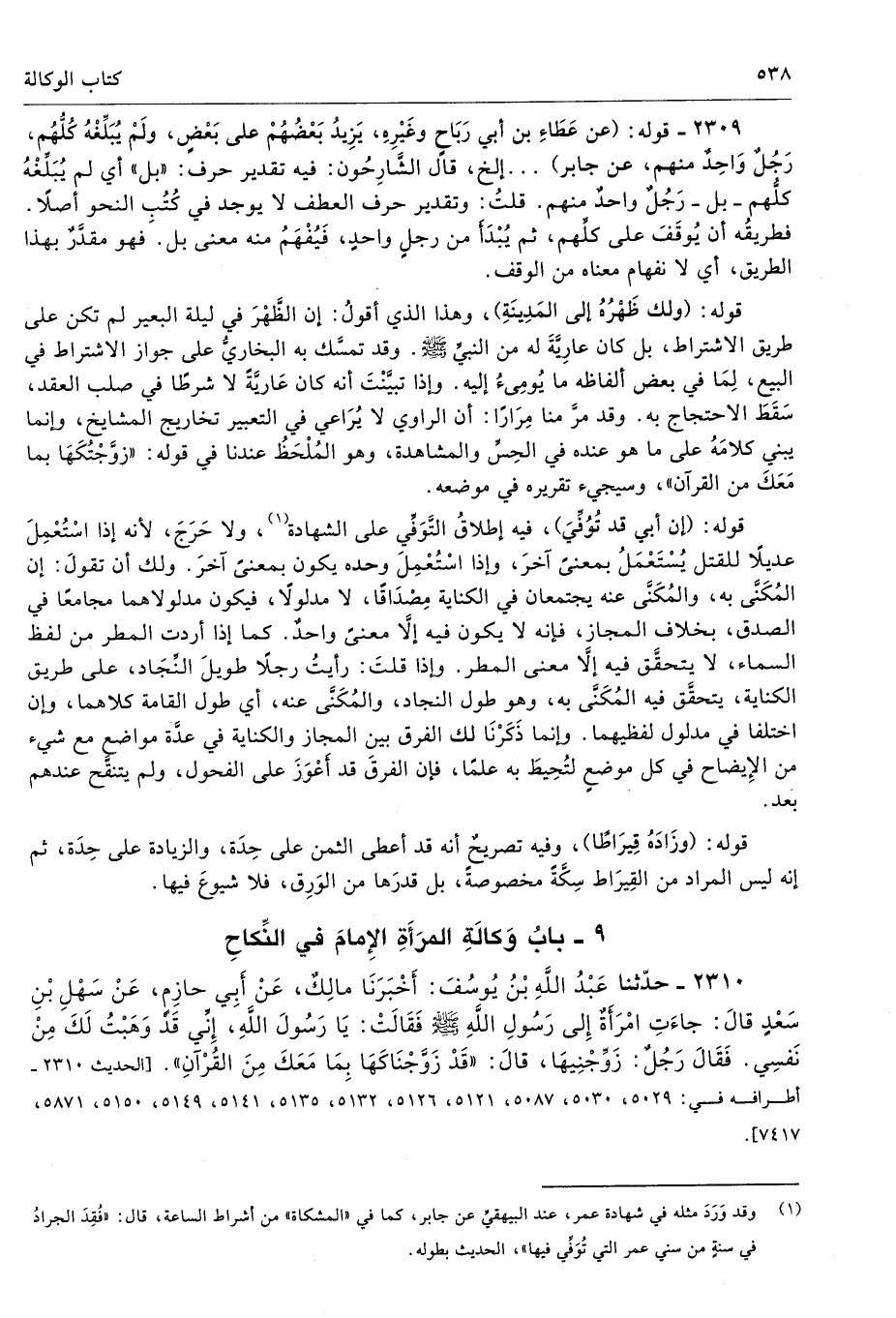 2309 - قوله: (عن عَطَاءِ بن أبي رَبَاحٍ وغَيْرِهِ، يَزِيدُ بَعْضُهُمْ على بَعْضٍ، ولَمْ يُبَلِّغْهُ كُلُّهُم، رَجُلٌ وَاحِدٌ منهم، عن جابر) ... إلخ، قال الشَّارِحُون: فيه تقدير حرف: «بل» أي لم يُبَلِّغْهُ كلَّهم - بل - رَجُلٌ واحدٌ منهم. قلتُ: وتقدير حرف العطف لا يوجد في كُتُبِ النحو أصلا. فطريقُه أن يُوقَفَ على كلِّهم، ثم يُبْدَأَ من رجلٍ واحدٍ، فَيُفْهَمُ منه معنى بل. فهو مقدَّرٌ بهذا الطريق، أي لا نفهام معناه من الوقف.