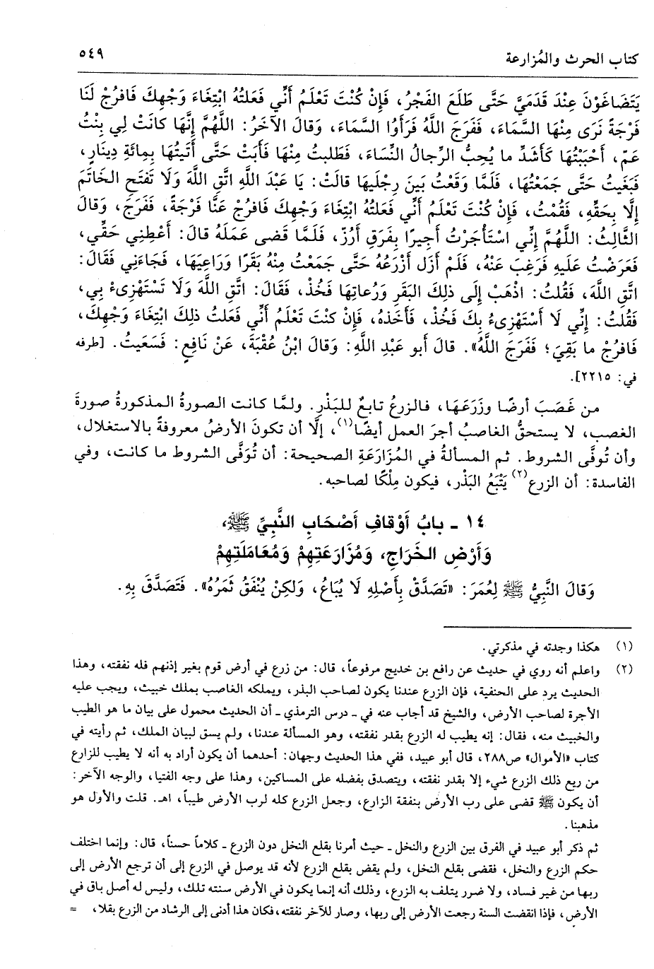 14 - بابُ أَوْقَافِ أَصْحَابِ النَّبِيِّ - صلى الله عليه وسلم - وَأَرْضِ الْخَرَاجِ، وَمُزَارَعَتِهِمْ وَمُعَامَلَتِهِمْ