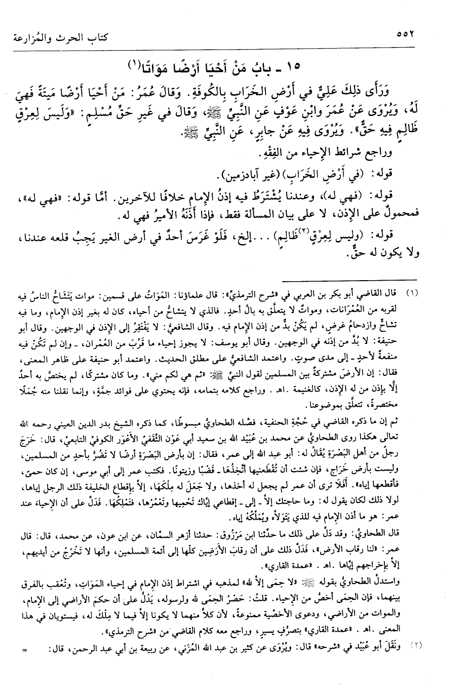 (¬1) قال القاضي أبو بكر بن العربي في "شرح الترمذي": قال علماؤنا: المَوَاتُ على قسمين: موات يَتَشَاحُّ الناسُ فيه لقربه من العُمْرَانات، ومواتٌ لا يتعلَّق به بالُ أحدٍ. فالذي لا يتشاحُّ من أحياه، كان له بغير إذن الإِمام، وما فيه تشاحٌّ وازدحامُ غرضٍ، لم يَكُنْ بدٌّ من إذن الإِمام فيه. وقال الشافعيُّ: لا يَفْتَقِرُ إلى الإِذن في الوجهين. وقال أبو حنيفة: لا بُدَّ من إذنه في الوجهين. وقال أبو يوسف: لا يجوز إحياء ما قَرُبَ من العُمْران، -وإن لم تَكُنْ فيه منفعةٌ لأحدٍ- إلى مدى صوتٍ. واعتمد الشافعيُّ على مطلق الحديث. واعتمد أبو حنيفة على ظاهر المعنى، فقال: إن الأرضَ مشتركةٌ بين المسلمين لقول النبيِّ - صلى الله عليه وسلم -: "ثم هي لكم مني". وما كان مشتركًا، لم يختصَّ به أحدٌ إلَّا بإِذن من له الإِذن، كالغنيمة. اهـ. وراجع كلامه بتمامه، فإنه يحتوي على فوائد جمَّةٍ، وإنما نقلنا منه جُمَلًا مختصرةً، تتعلَّق بموضوعنا.