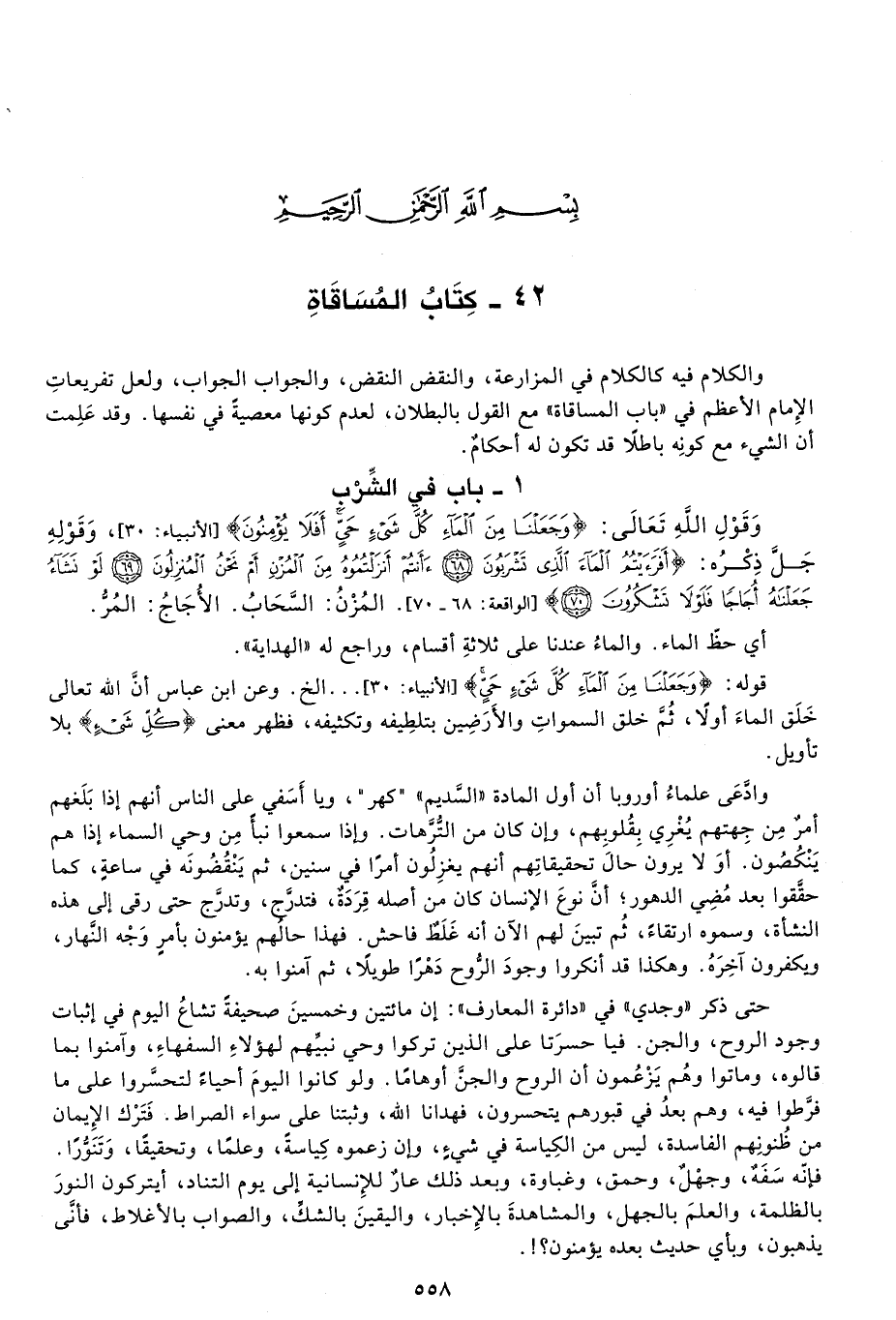 وَقَوْلِ اللَّهِ تَعَالَى {وَجَعَلْنَا مِنَ الْمَاءِ كُلَّ شَيْءٍ حَيٍّ أَفَلَا يُؤْمِنُونَ} [الأنبياء: 30]، وَقَوْلِهِ جَلَّ ذِكْرُهُ: {أَفَرَأَيْتُمُ الْمَاءَ الَّذِي تَشْرَبُونَ (68) أَأَنْتُمْ أَنْزَلْتُمُوهُ مِنَ الْمُزْنِ أَمْ نَحْنُ الْمُنْزِلُونَ (69) لَوْ نَشَاءُ جَعَلْنَاهُ أُجَاجًا فَلَوْلَا تَشْكُرُونَ (70)} [الواقعة: 68 - 70]. الْمُزْنُ: السَّحَابُ. الأُجَاجُ الْمُرُّ.