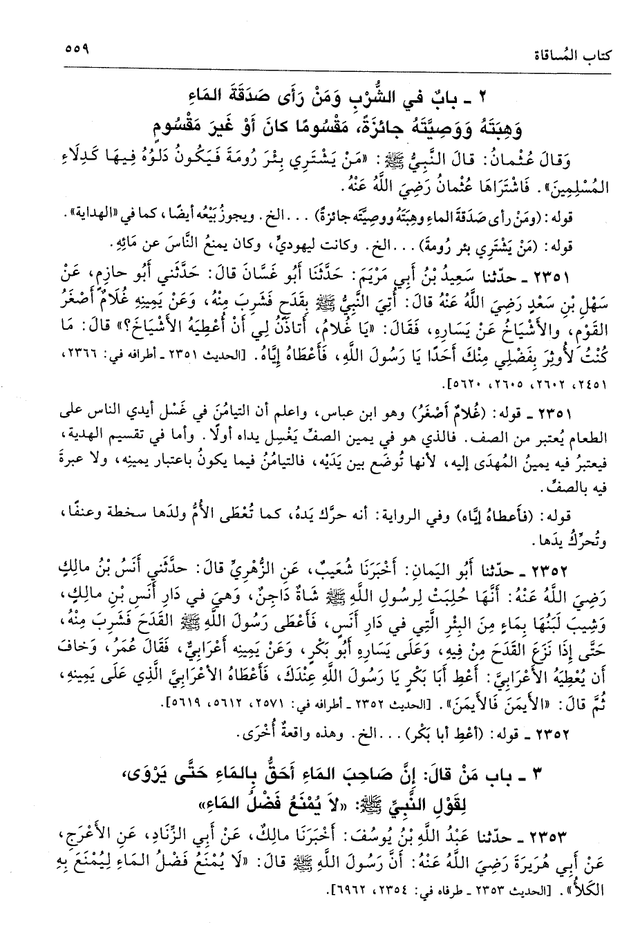 2 - بابٌ فِى الشُّرْبِ وَمَنْ رَأَى صَدَقَةَ الْمَاءِ وَهِبَتَهُ وَوَصِيَّتَهُ جَائِزَةً، مَقْسُومًا كَانَ أَوْ غَيْرَ مَقْسُومٍ
