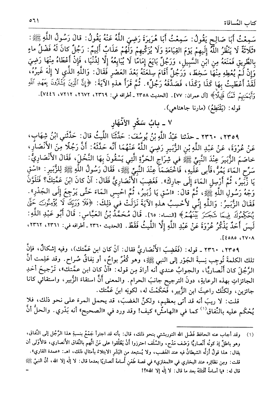 - قوله: (فَغَضِبَ الأَنْصَاريُّ فقال: أَنْ كان ابن عَمَّتك)، وفيه إشكالٌ، فإنَّ تلك الكلمةَ تُوجِب نِسبةَ الجَوْر إلى النبي صلى الله عليه وسلّم وهو كُفْرٌ بواحٌ، أو نِفاقٌ صُراح. وقد عَلِمت أنَّ الرَّجُلَ كان أَنْصاريًّا، والجوابُ عندي أنه أرادَ مِن قوله: «أَنْ كان ابن عمَّتك»، تَرْجيحَ أحَدِ الجائزاتِ بهذه الرعايةِ، دونَ الترجيح جانبَ الحرام. والمعنى أَنَّ استقاءَ الزُّبير، واستقائي كانا جائزين، ولكنَّك راعيتَ ابن الزُّبير، فَحَكَمْتَ له، لكونِه ابنَ عَمَّتك.