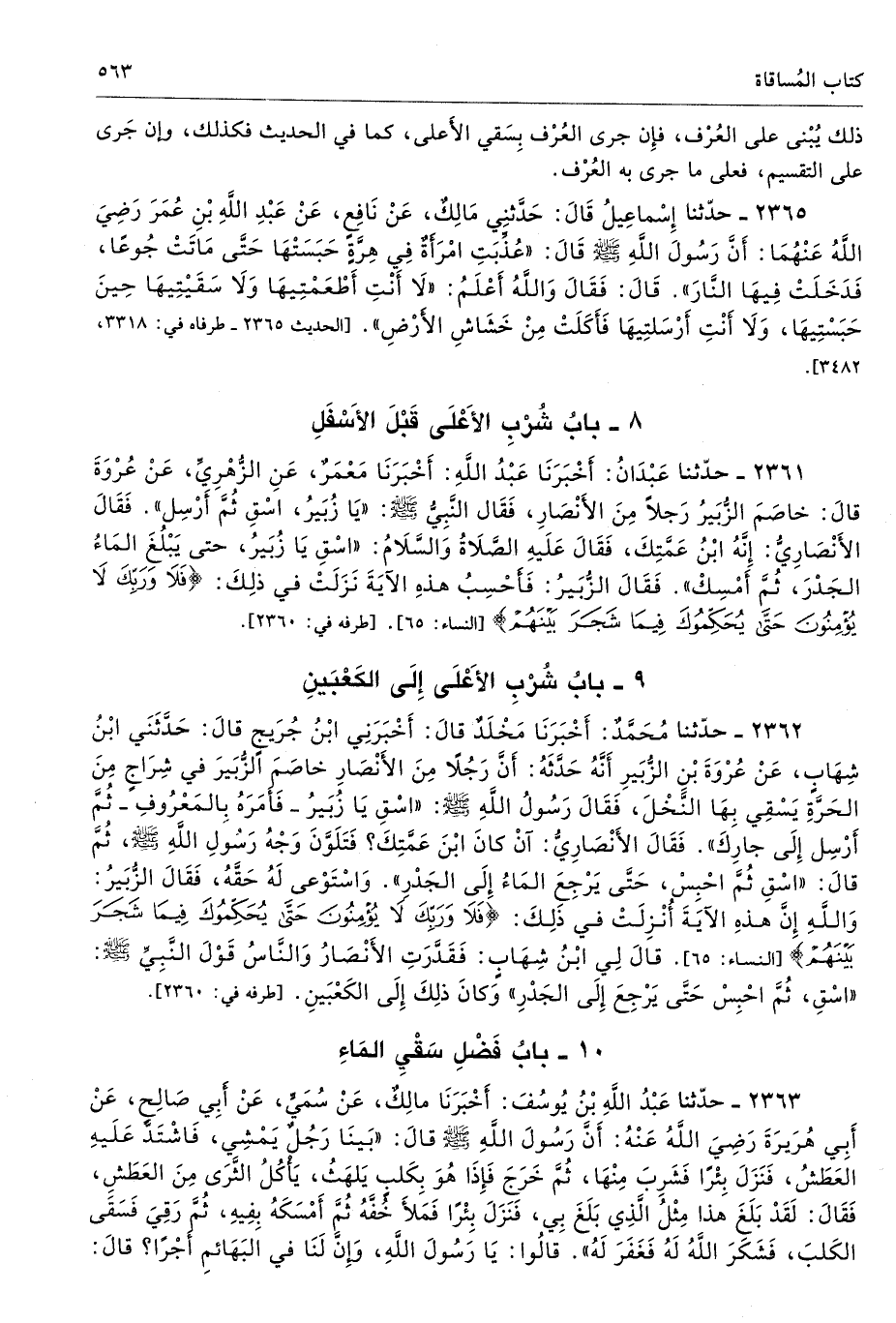 2361 - حَدَّثَنَا عَبْدَانُ أَخْبَرَنَا عَبْدُ اللَّهِ أَخْبَرَنَا مَعْمَرٌ عَنِ الزُّهْرِىِّ عَنْ عُرْوَةَ قَالَ خَاصَمَ الزُّبَيْرَ رَجُلٌ مِنَ الأَنْصَارِ، فَقَالَ النَّبِىُّ - صلى الله عليه وسلم - «يَا زُبَيْرُ اسْقِ ثُمَّ أَرْسِلْ». فَقَالَ الأَنْصَارِىُّ إِنَّهُ ابْنُ عَمَّتِكَ. فَقَالَ عَلَيْهِ السَّلاَمُ «اسْقِ يَا زُبَيْرُ، ثُمَّ يَبْلُغُ الْمَاءُ الْجَدْرَ، ثُمَّ أَمْسِكْ». فَقَالَ الزُّبَيْرُ فَأَحْسِبُ هَذِهِ الآيَةَ نَزَلَتْ فِى ذَلِكَ {فَلَا وَرَبِّكَ لَا يُؤْمِنُونَ حَتَّى يُحَكِّمُوكَ فِيمَا شَجَرَ بَيْنَهُمْ} [النساء: 65]. أطرافه 2360، 2362، 2708، 4585 - تحفة 3634