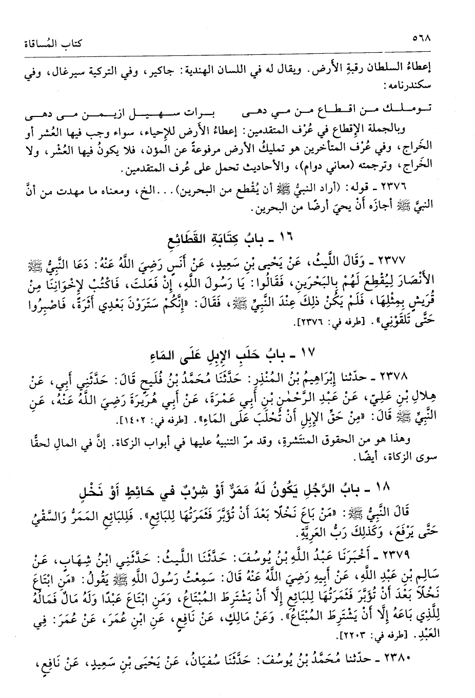 2378 - حَدَّثَنَا إِبْرَاهِيمُ بْنُ الْمُنْذِرِ حَدَّثَنَا مُحَمَّدُ بْنُ فُلَيْحٍ قَالَ حَدَّثَنِى أَبِى عَنْ هِلاَلِ بْنِ عَلِىٍّ عَنْ عَبْدِ الرَّحْمَنِ بْنِ أَبِى عَمْرَةَ عَنْ أَبِى هُرَيْرَةَ - رضى الله عنه - عَنِ النَّبِىِّ - صلى الله عليه وسلم - قَالَ «مِنْ حَقِّ الإِبِلِ أَنْ تُحْلَبَ عَلَى الْمَاءِ». أطرافه 1402، 3073، 6958 - تحفة 13609