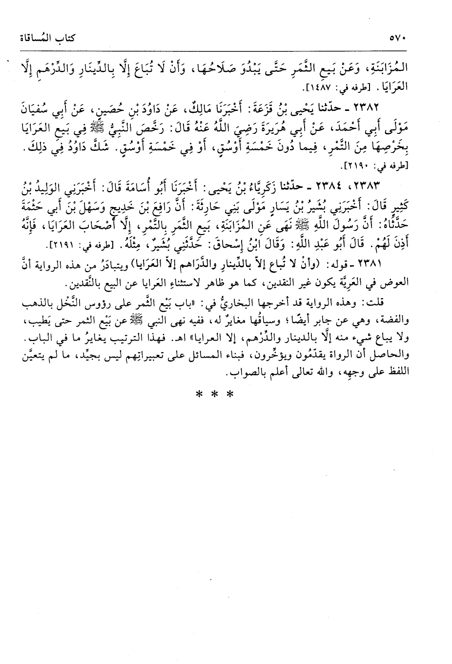 2381 - قوله: (وأنْ لا تُباع إلاّ بالدِّينارِ والدَّرَاهم إلاّ العَرَايا) ويتبادَرُ من هذه الرواية أنَّ العوض في العَرِيَّة يكون غير النقدين، كما هو ظاهر لاستثناءِ العَرايا عن البيع بالنَّقدين.