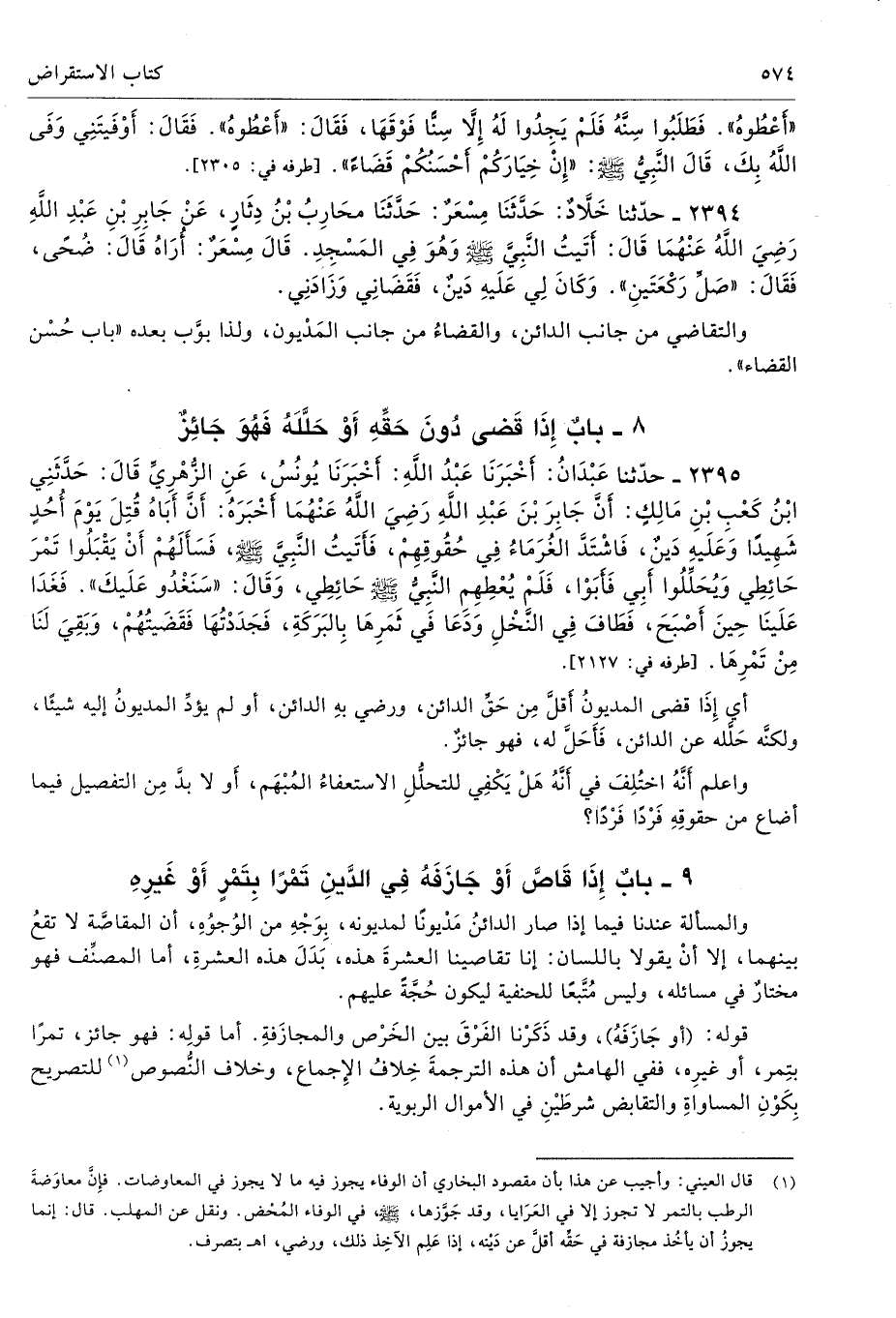 «أَعْطُوهُ». فَطَلَبُوا سِنَّهُ، فَلَمْ يَجِدُوا لَهُ إِلاَّ سِنًّا فَوْقَهَا. فَقَالَ «أَعْطُوهُ». فَقَالَ أَوْفَيْتَنِى، وَفَّى اللَّهُ بِكَ. قَالَ النَّبِىُّ - صلى الله عليه وسلم - «إِنَّ خِيَارَكُمْ أَحْسَنُكُمْ قَضَاءً». أطرافه 2305، 2306، 2390، 2392، 2401، 2606، 2609 - تحفة 14963