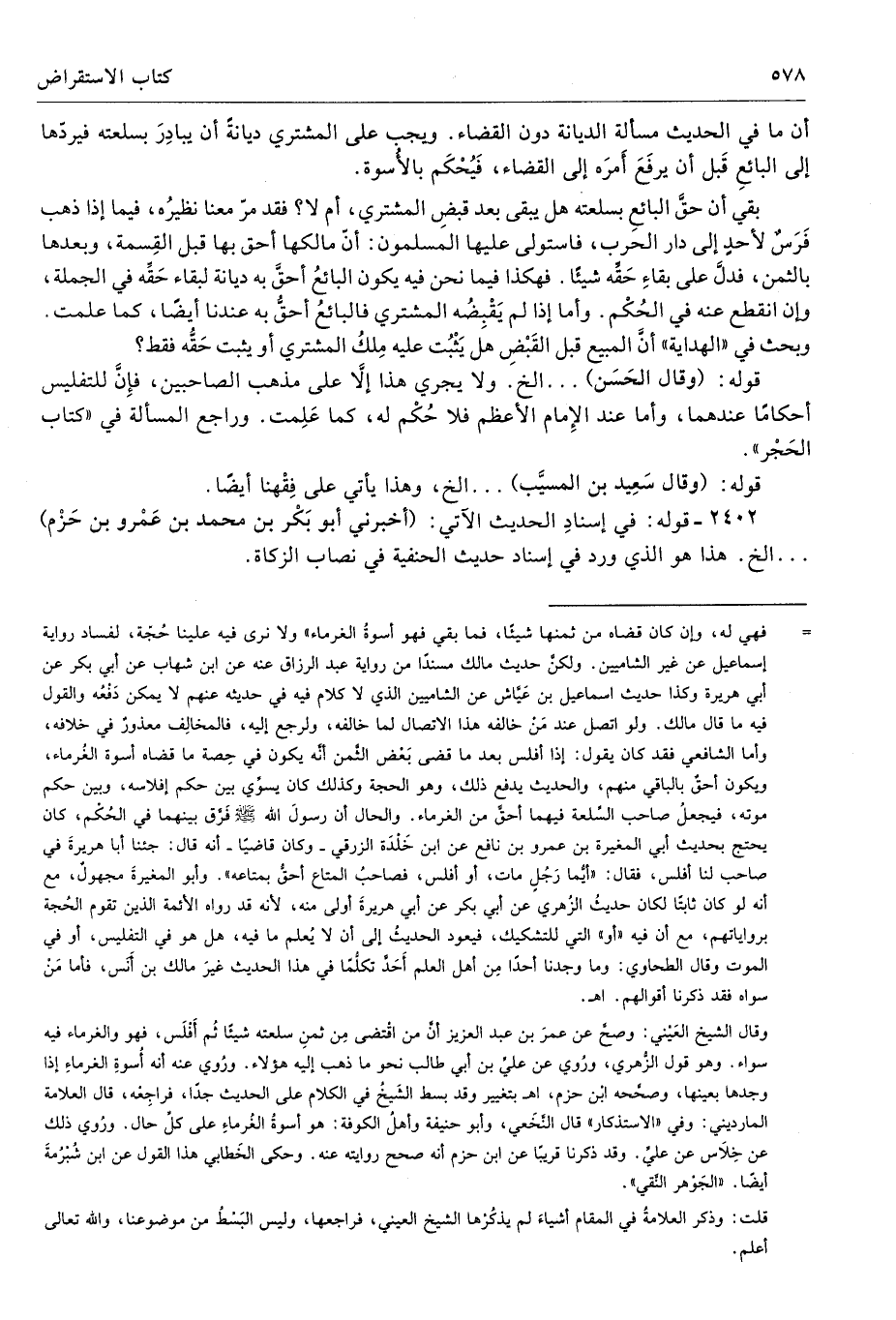 وقال الشيخ العَيني: وصحَّ عن عمرَ بن عبد العزيز أنَّ من اقْتضى مِن ثمنِ سلعته شيئًا ثُم أَفلَس، فهو والغرماء فيه سواء. وهو قول الزُّهري، ورُوي عن عليِّ بن أبي طالب نحو ما ذهب إليه هؤلاء. ورُوي عنه أنه أُسوةِ الغرماءِ إذا وجدها بعينها، وصحَّحه ابن حزم، اهـ بتغيير وقد بسط الشَيخ في الكلام على الحديث جدًا، فراجِعْه، قال العلامة المارديني: وفي "الاستذكار" قال النَّخَعي، وأبو حنيفة وأهلُ الكوفة: هو أسوةُ الغُرماءِ على كل حال. ورُوي ذلك عن خِلاس عن عليِّ. وقد ذكرنا قريبًا عن ابن حزم أنه صحح روايته عنه. وحكى الخَطابي هذا القول عن ابن شُبْرُمةَ أيضًا. "الجَوْهر النَّقي".