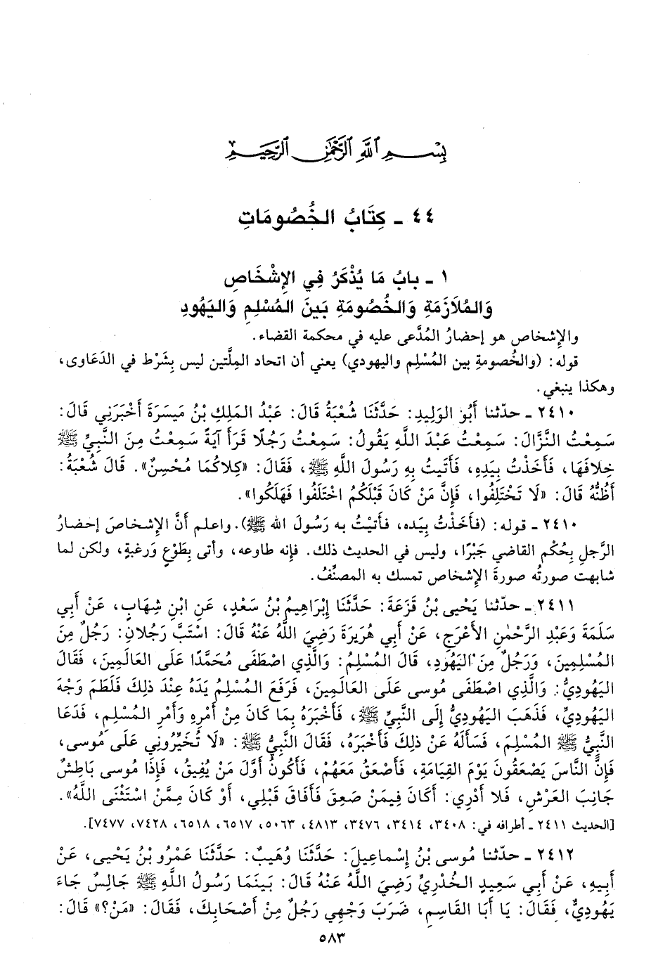 2411 - حَدَّثَنَا يَحْيَى بْنُ قَزَعَةَ حَدَّثَنَا إِبْرَاهِيمُ بْنُ سَعْدٍ عَنِ ابْنِ شِهَابٍ عَنْ أَبِى سَلَمَةَ وَعَبْدِ الرَّحْمَنِ الأَعْرَجِ عَنْ أَبِى هُرَيْرَةَ - رضى الله عنه - قَالَ اسْتَبَّ رَجُلاَنِ رَجُلٌ مِنَ الْمُسْلِمِينَ وَرَجُلٌ مِنَ الْيَهُودِ، قَالَ الْمُسْلِمُ وَالَّذِى اصْطَفَى مُحَمَّدًا عَلَى الْعَالَمِينَ، فَقَالَ الْيَهُودِىُّ وَالَّذِى اصْطَفَى مُوسَى عَلَى الْعَالَمِينَ. فَرَفَعَ الْمُسْلِمُ يَدَهُ عِنْدَ ذَلِكَ فَلَطَمَ وَجْهَ الْيَهُودِىِّ، فَذَهَبَ الْيَهُودِىُّ إِلَى النَّبِىِّ - صلى الله عليه وسلم - فَأَخْبَرَهُ بِمَا كَانَ مِنْ أَمْرِهِ وَأَمْرِ الْمُسْلِمِ، فَدَعَا النَّبِىُّ - صلى الله عليه وسلم - الْمُسْلِمَ فَسَأَلَهُ عَنْ ذَلِكَ، فَأَخْبَرَهُ فَقَالَ النَّبِىُّ - صلى الله عليه وسلم - «لاَ تُخَيِّرُونِى عَلَى مُوسَى، فَإِنَّ النَّاسَ يَصْعَقُونَ يَوْمَ الْقِيَامَةِ، فَأَصْعَقُ مَعَهُمْ، فَأَكُونُ أَوَّلَ مَنْ يُفِيقُ، فَإِذَا مُوسَى بَاطِشٌ جَانِبَ الْعَرْشِ، فَلاَ أَدْرِى أَكَانَ فِيمَنْ صَعِقَ فَأَفَاقَ قَبْلِى، أَوْ كَانَ مِمَّنِ اسْتَثْنَى اللَّهُ». أطرافه 3408، 3414، 4813، 6517، 6518، 7428، 7472 تحفة 15127، 13956