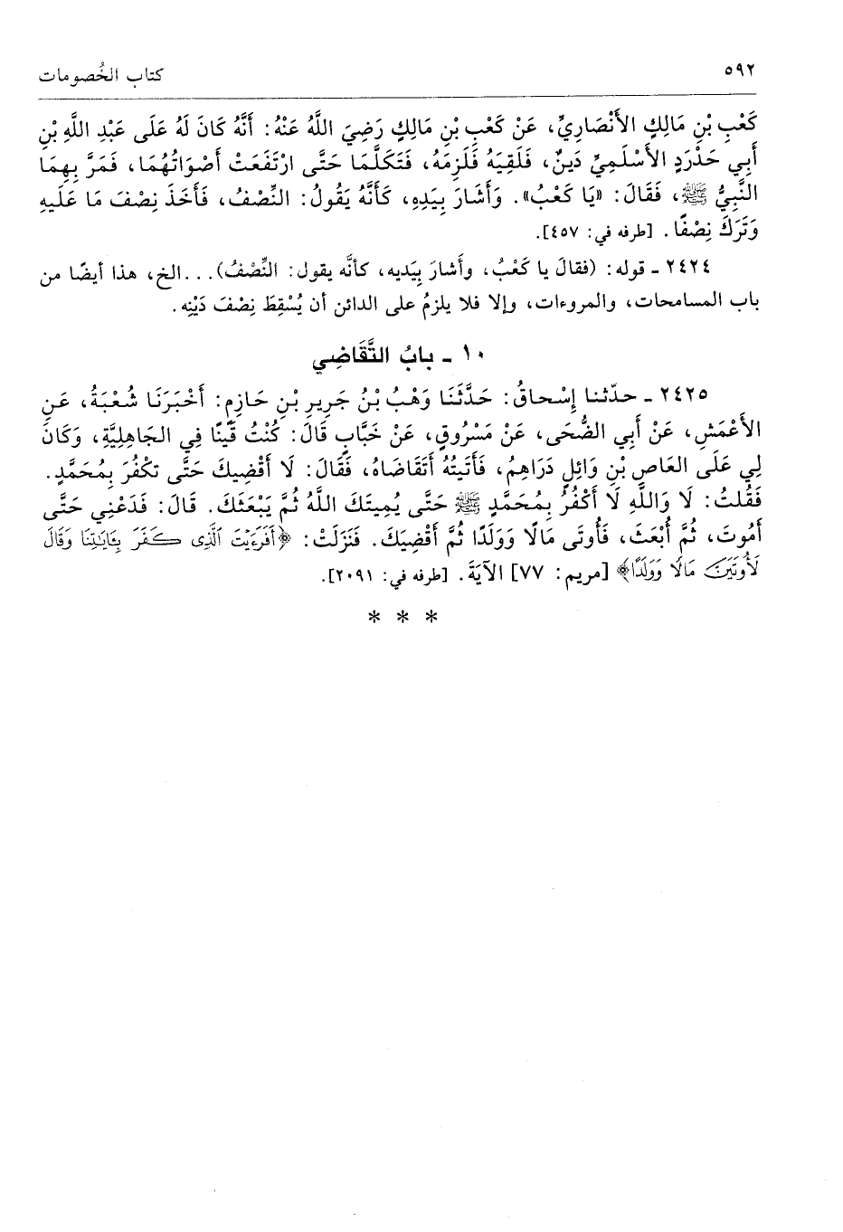 2425 - حَدَّثَنَا إِسْحَاقُ حَدَّثَنَا وَهْبُ بْنُ جَرِيرِ بْنِ حَازِمٍ أَخْبَرَنَا شُعْبَةُ عَنِ الأَعْمَشِ عَنْ أَبِى الضُّحَى عَنْ مَسْرُوقٍ عَنْ خَبَّابٍ قَالَ كُنْتُ قَيْنًا فِى الْجَاهِلِيَّةِ وَكَانَ لِى عَلَى الْعَاصِ بْنِ وَائِلٍ دَرَاهِمُ، فَأَتَيْتُهُ أَتَقَاضَاهُ فَقَالَ لاَ أَقْضِيكَ حَتَّى تَكْفُرَ بِمُحَمَّدٍ، فَقُلْتُ لاَ وَاللَّهِ لاَ أَكْفُرُ بِمُحَمَّدٍ - صلى الله عليه وسلم - حَتَّى يُمِيتَكَ اللَّهُ ثُمَّ يَبْعَثَكَ. قَالَ فَدَعْنِى حَتَّى أَمُوتَ ثُمَّ أُبْعَثَ فَأُوتَى مَالاً وَوَلَدًا، ثُمَّ أَقْضِيَكَ. فَنَزَلَتْ {أَفَرَأَيْتَ الَّذِي كَفَرَ بِآيَاتِنَا وَقَالَ لَأُوتَيَنَّ مَالًا وَوَلَدًا} [مريم: 77] الآيَةَ. أطرافه 2091، 2275، 4732، 4733، 4734، 4735 - تحفة 3520