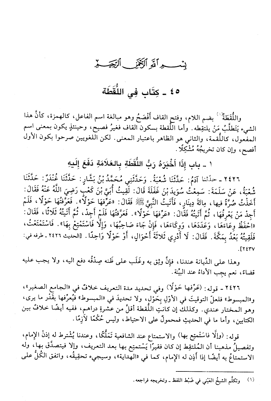 2426 - قوله: (عَرِّفها حَوْلا) وفي تحديد مدِة التعريف خلافٌ في «الجامع الصغير»، و «المبسوط» فلعلّ التوقيتَ في الأوّلِ بِحَوْل، ولا تحديدَ في «المبسوط» فيُعرِّفها بقَدْر ما يرى، وهو المختار عندي. وكذلك إن كانتِ اللُّقطة أقلَّ من عشرةِ دراهمِ، ففيه أيضًا خلافٌ بين الكتابين، وأما ما في الحديثِ فمحمولٌ على الاحتياط، وليس حُكْمًا لازِمًا.