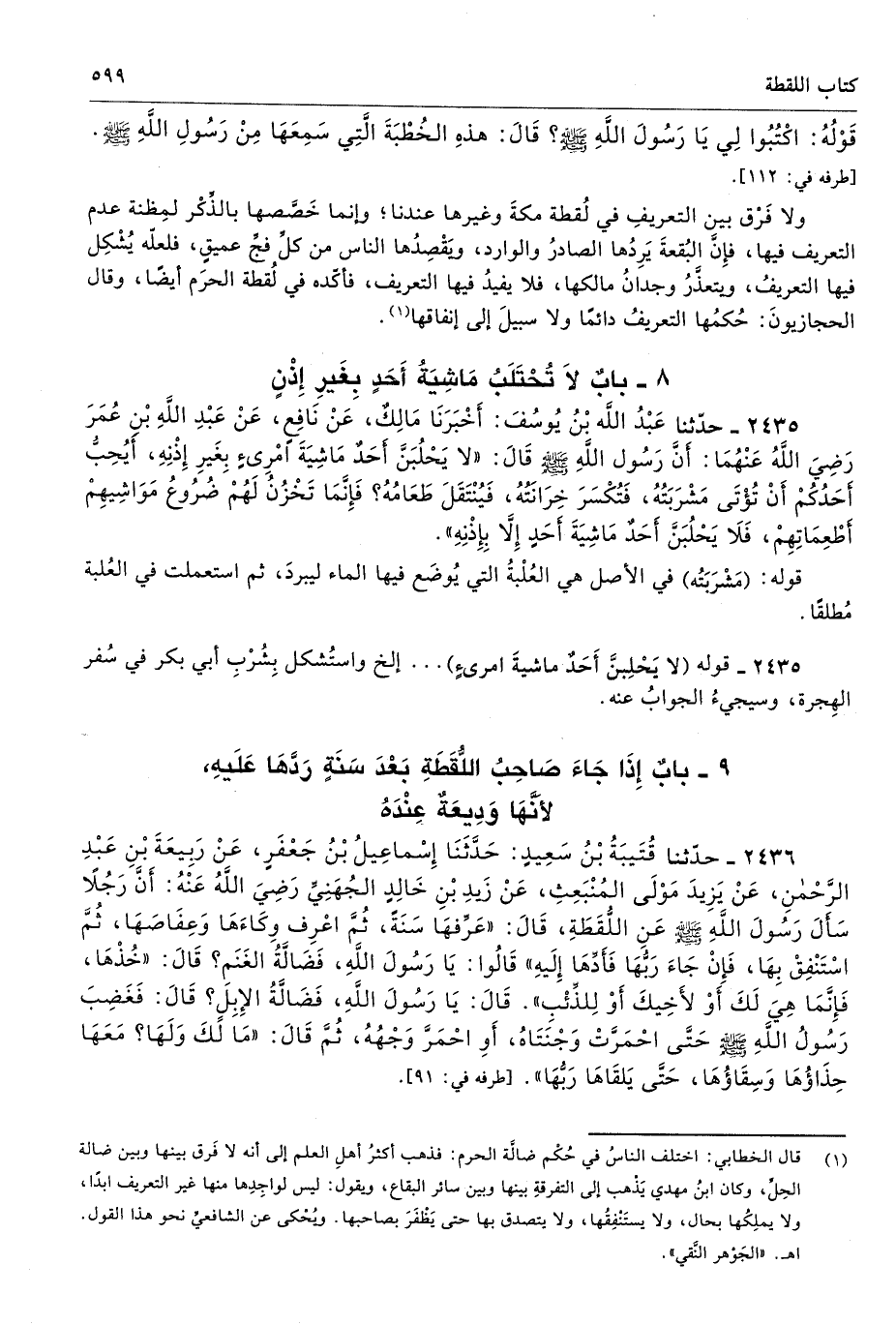 2436 - حَدَّثَنَا قُتَيْبَةُ بْنُ سَعِيدٍ حَدَّثَنَا إِسْمَاعِيلُ بْنُ جَعْفَرٍ عَنْ رَبِيعَةَ بْنِ أَبِى عَبْدِ الرَّحْمَنِ عَنْ يَزِيدَ مَوْلَى الْمُنْبَعِثِ عَنْ زَيْدِ بْنِ خَالِدٍ الْجُهَنِىِّ - رضى الله عنه - أَنَّ رَجُلًا سَأَلَ رَسُولَ اللَّهِ - صلى الله عليه وسلم - عَنِ اللُّقَطَةِ قَالَ «عَرِّفْهَا سَنَةً، ثُمَّ اعْرِفْ وِكَاءَهَا وَعِفَاصَهَا، ثُمَّ اسْتَنْفِقْ بِهَا، فَإِنْ جَاءَ رَبُّهَا فَأَدِّهَا إِلَيْهِ». قَالُوا يَا رَسُولَ اللَّهِ فَضَالَّةُ الْغَنَمِ قَالَ «خُذْهَا فَإِنَّمَا هِىَ لَكَ أَوْ لأَخِيكَ أَوْ لِلذِّئْبِ». قَالَ يَا رَسُولَ اللَّهِ، فَضَالَّةُ الإِبِلِ قَالَ فَغَضِبَ رَسُولُ اللَّهِ - صلى الله عليه وسلم - حَتَّى احْمَرَّتْ وَجْنَتَاهُ - أَوِ احْمَرَّ وَجْهُهُ - ثُمَّ قَالَ «مَا لَكَ وَلَهَا، مَعَهَا حِذَاؤُهَا وَسِقَاؤُهَا، حَتَّى يَلْقَاهَا رَبُّهَا». أطرافه 91، 2372، 2427، 2428، 2429، 2438، 5292، 6112 - تحفة 3763