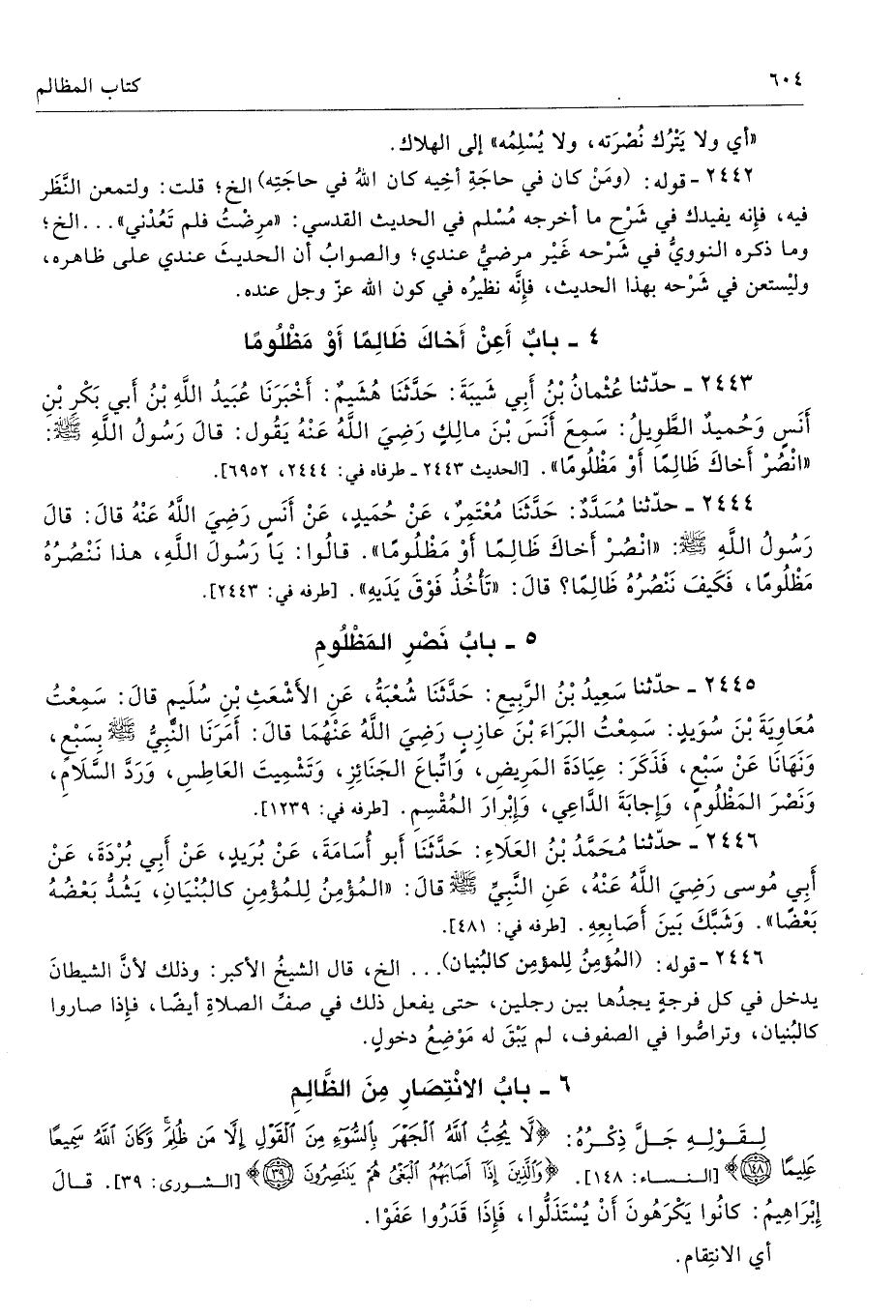 2444 - حَدَّثَنَا مُسَدَّدٌ حَدَّثَنَا مُعْتَمِرٌ عَنْ حُمَيْدٍ عَنْ أَنَسٍ - رضى الله عنه - قَالَ قَالَ رَسُولُ اللَّهِ - صلى الله عليه وسلم - «انْصُرْ أَخَاكَ ظَالِمًا أَوْ مَظْلُومًا». قَالُوا يَا رَسُولَ اللَّهِ هَذَا نَنْصُرُهُ مَظْلُومًا، فَكَيْفَ نَنْصُرُهُ ظَالِمًا قَالَ «تَأْخُذُ فَوْقَ يَدَيْهِ». طرفاه 2443، 6952 - تحفة 775