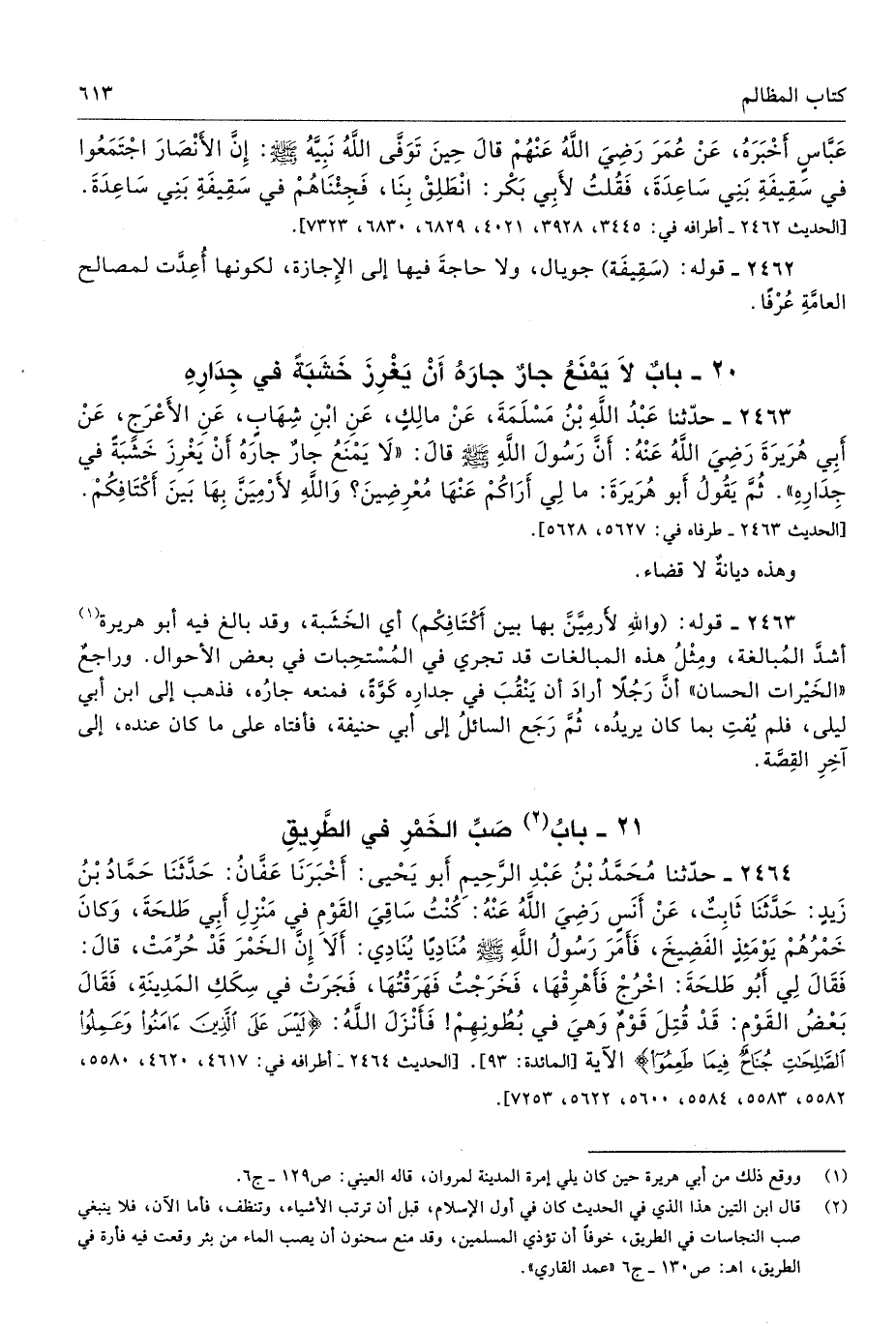 2463 - قوله: (واللهِ لأَرمِيَّنَّ بها بين أَكْتَافِكْم) أي الخَشَبة، وقد بالغ فيه أبو هريرة (¬1) أشدَّ المُبالغة، ومِثْلُ هذه المبالغات قد تجري في المُسْتحِبات في بعض الأحوال. وراجعٌ «الخَيْرات الحسان» أنَّ رَجُلا أرادَ أن يَنْقُبَ في جدارِه كَوَّةً، فمنعه جارُه، فذهب إلى ابن أبي ليلى، فلم يُفتي بما كان يريدُه، ثُمَّ رَجَع السائلُ إلى أبي حنيفة، فأفتاه على ما كان عنده، إلى آخِرِ القِصَّة.